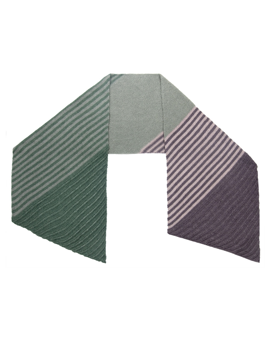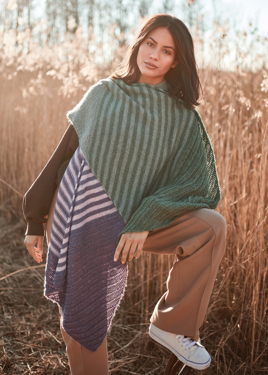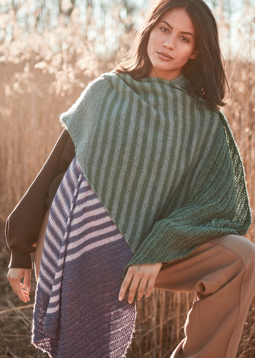 Lana Grossa Lace Seta Mulberry (35% Seide (Maulbeer), 35% (Baby) Alpaca, 30% Schurwolle (Merino extrafein), Lauflänge 175 m/50 g), 150 g Graugrün (Fb 13), 100 g Pflaume (Fb 5), 100 g Pastellflieder (Fb 3) und 100 g Dunkelgrün (Fb 19); Stricknadeln Nr. 5.