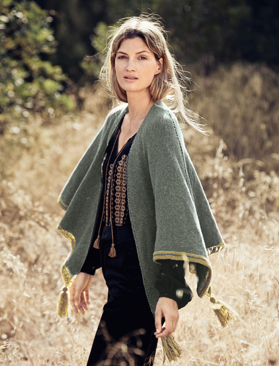 Lana Grossa Cashmere 16 fine (80% Schurwolle, 10% Kaschmir, 10% Polyamid, Lauflänge 320 m/50 g), 250 g in Graugrün (Fb 34) und 50 g in Senf (Fb 35); Rundstricknadel Nr. 6,0 in 80 und 120 cm Länge.