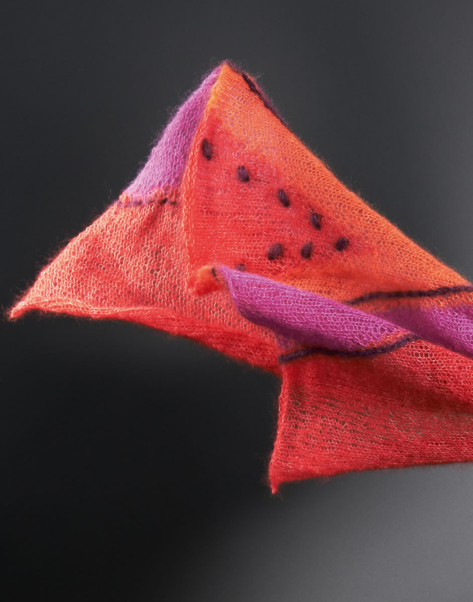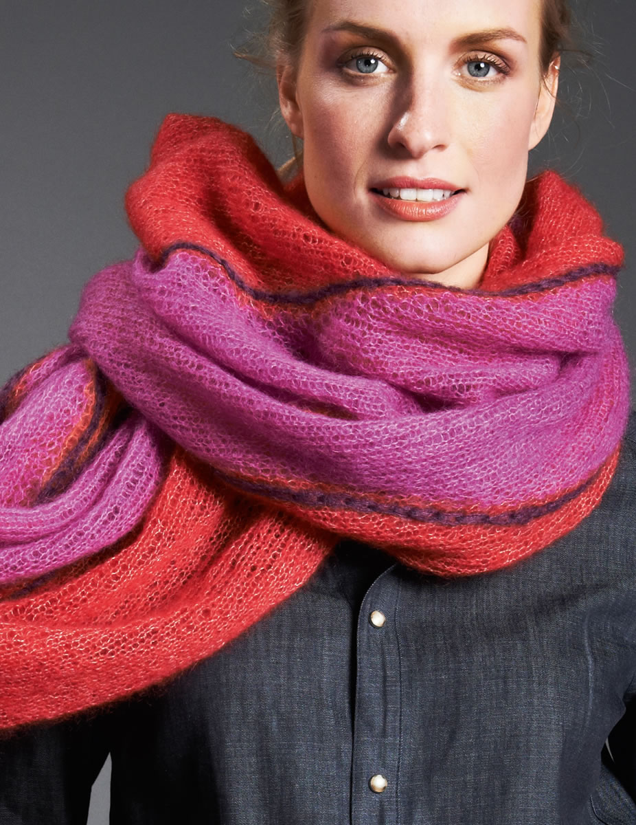 Lana Grossa-Qualität „Silkhair Melange“ (70 % Mohair (Superkid), 30 % Seide, Lauflänge ca. 210 m/25 g): ca. 125 g Himbeer meliert (Fb. 717) und Lana Grossa-Qualität „Silkhair“ (70 % Mohair (Superkid), 30 % Seide, Lauflänge ca. 210 m/25 g): je ca. 50 g Mandarin (Fb. 37), Zyklam (Fb. 64) und ca. 25 g Aubergine (Fb. 21); 1 Rundstricknadel Nr. 5, 100 cm lang; 1 stumpfe Sticknadel.
