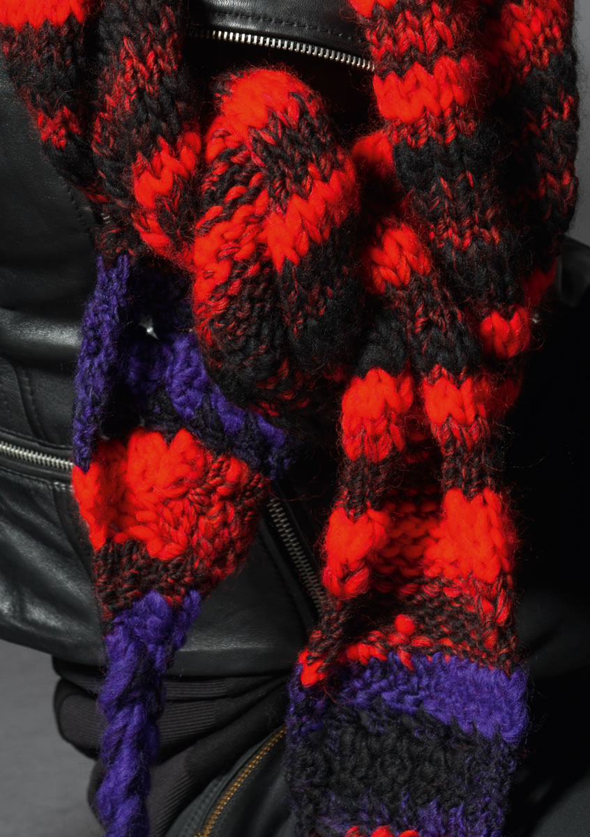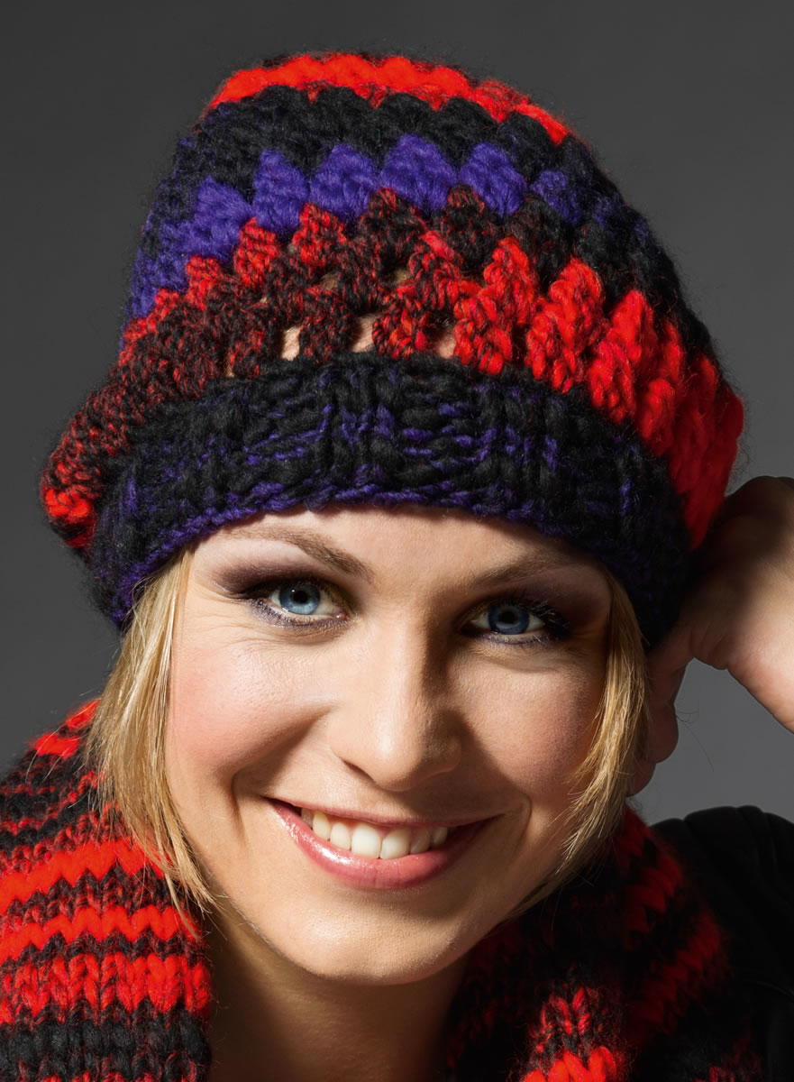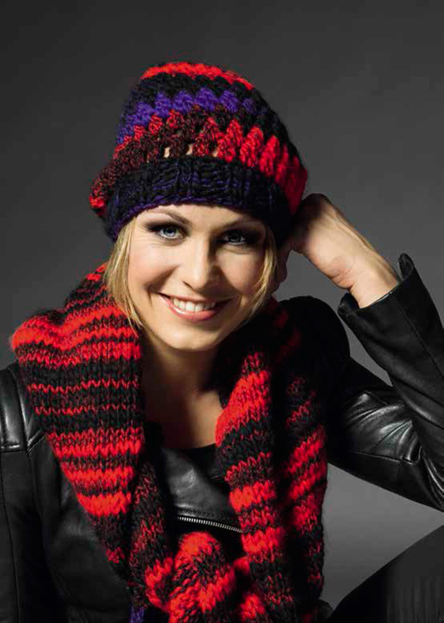 Lana Grossa Qualität „Olympia”, 53 % Schurwolle, 47 % Polyacryl, Lauflänge 100 m/100 g; 400 g Neonrot/ Schwarz (Fb 200) = 300 g für das Tuch und 100 g für die Mütze sowie 200 g Neonlila/Schwarz (Fb 206) = je 100 g für das Tuch und die Mütze, Stricknadeln Nr. 10, ein Stricknadelspiel Nr. 8, eine Häkelnadel Nr. 6.