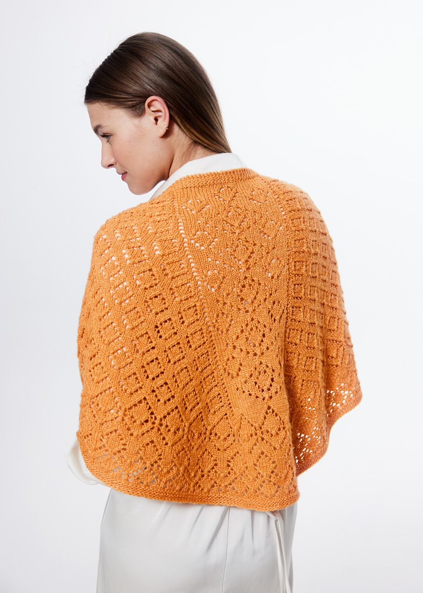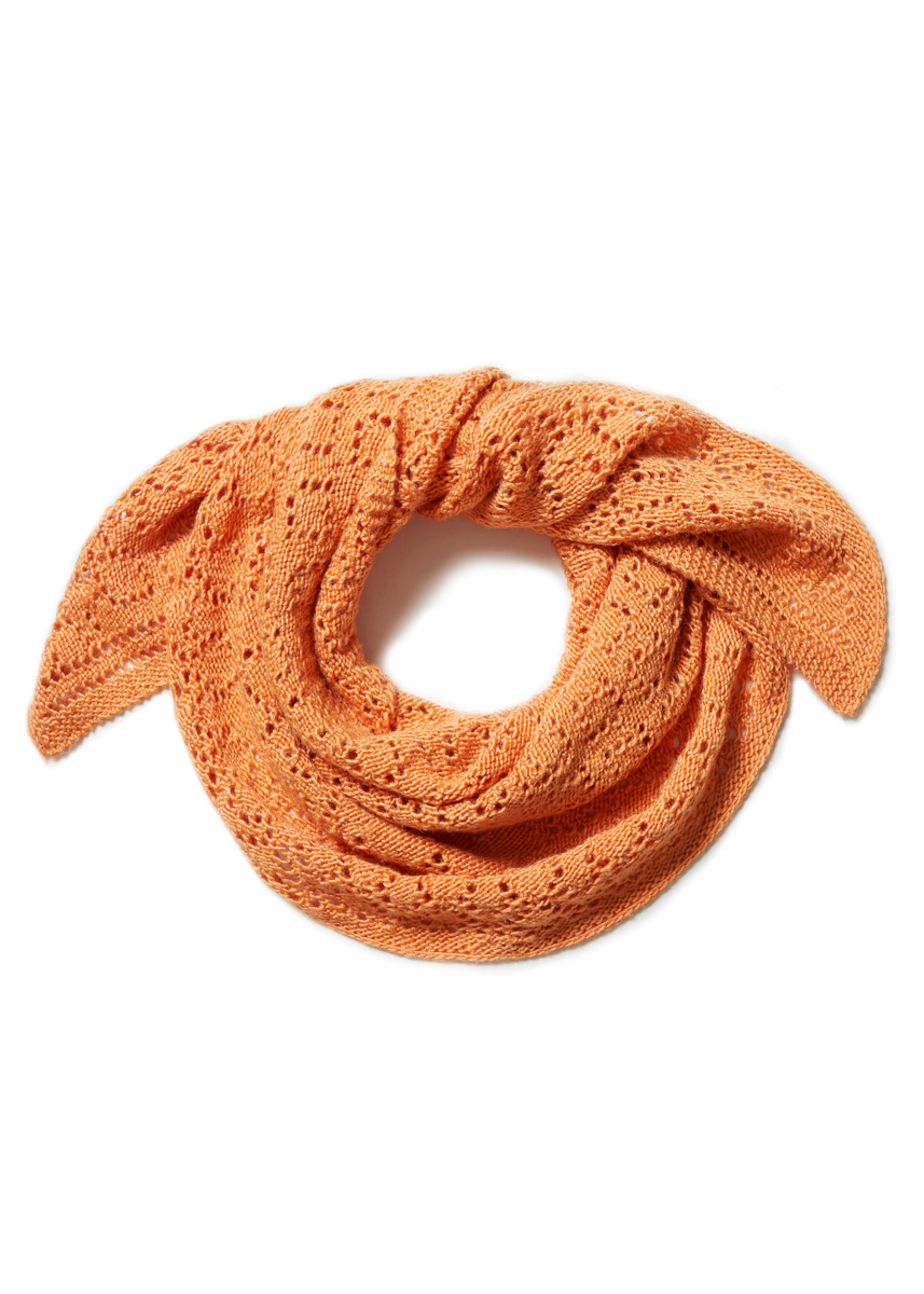 Lana Grossa Setosa (65% Schurwolle (Merino superfein), 35% Seide, Lauflänge 150 m/50 g), 250 g Orange (Fb. 7); 1 Rundstricknadel Nr. 4,5, 80 – 100 cm lang, für den offenen M-Anschlag ein separates Seil einer Rundstricknadel, 2 Maschenmarkierer.