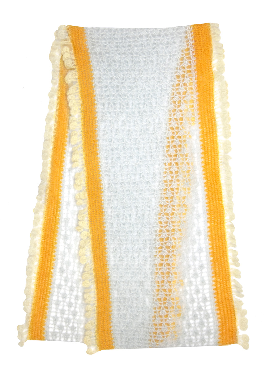 Lana Grossa Silkhair (70% Mohair, 30% Seide, Lauflänge 210 m/25 g), 75 g Silbergrau (Fb 41), 50 g Bernstein (Fb 146) und 50 g Rohweiß (Fb 52); 1 Häkelnadel Nr. 4.