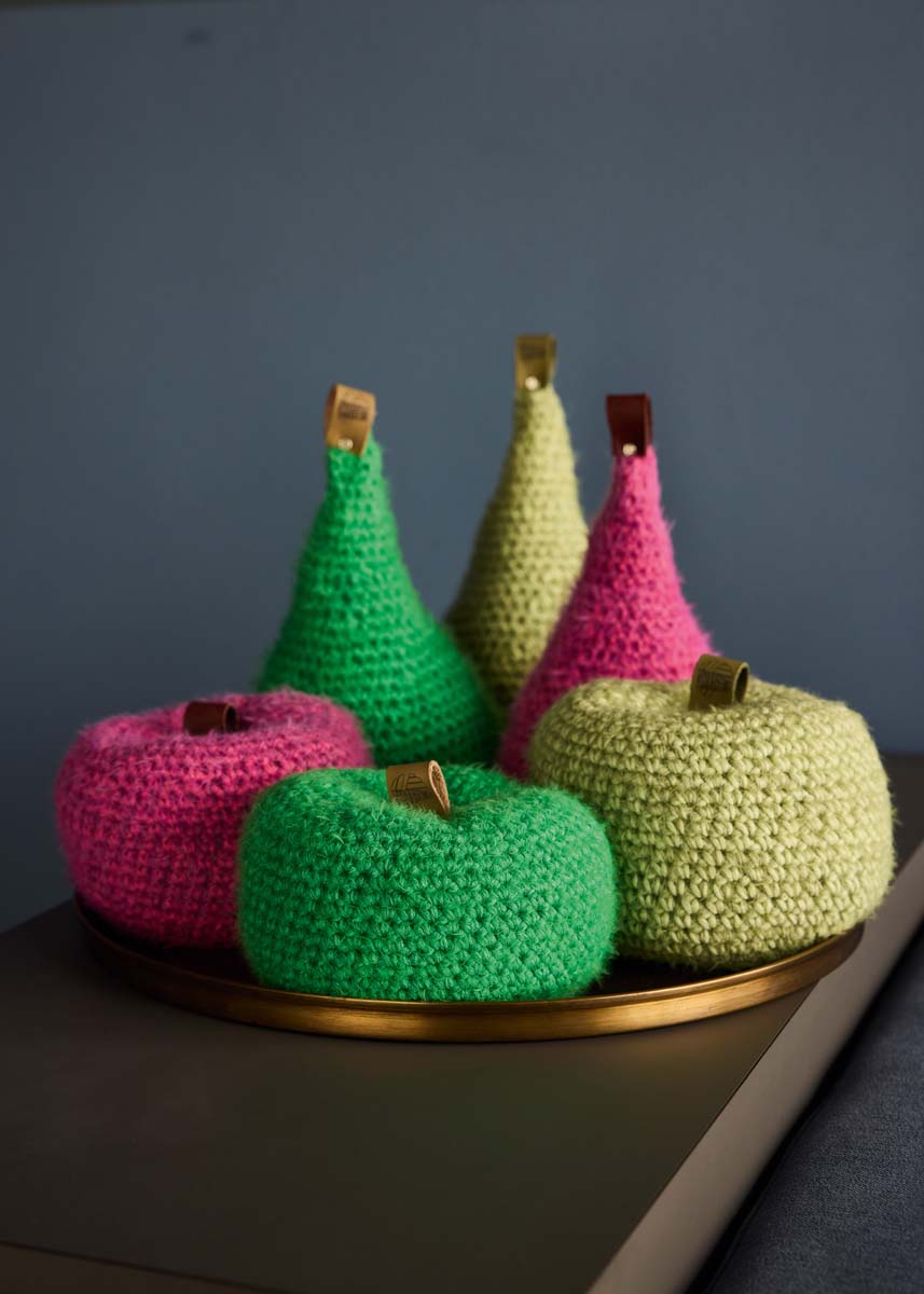 Hinweis: Alles mit dreifachem Faden häkeln, und zwar mit 1 Faden Organico + 2 Fäden Per Fortuna, dabei die Farben jeder Qualität in der Reihenfolge zusammen verwenden, wie sie in der Materialangabe aufgeführt sind. In jeder Farb- und Materialkombination 1 Türstopper häkeln [= 3 Stopper]. Zum Schluss auch das farblich passende Label anbringen.