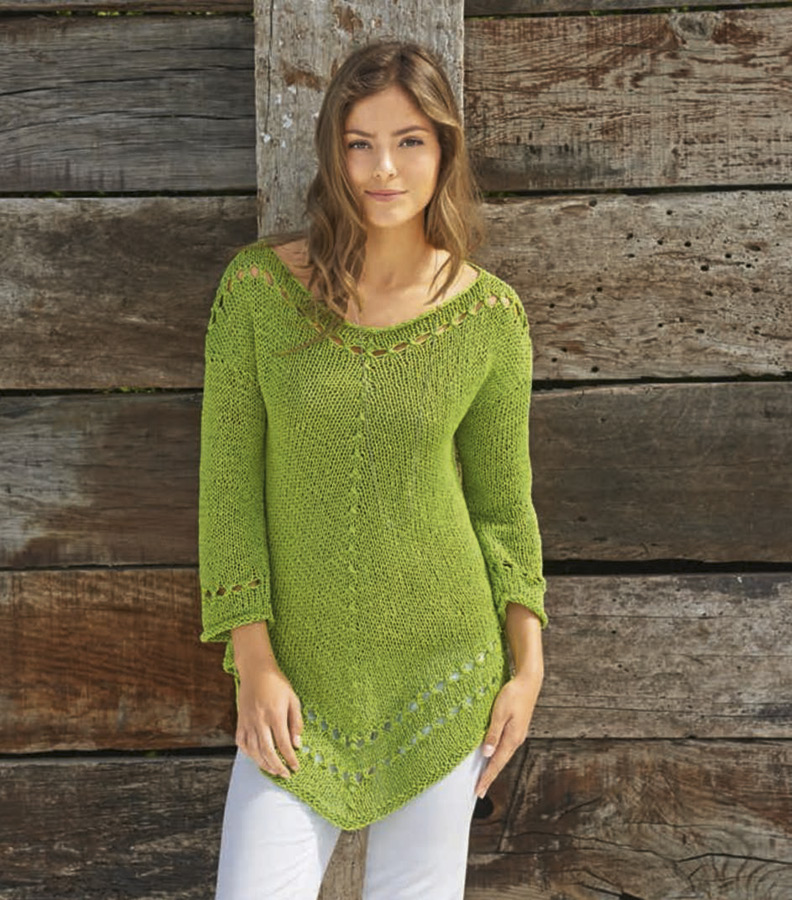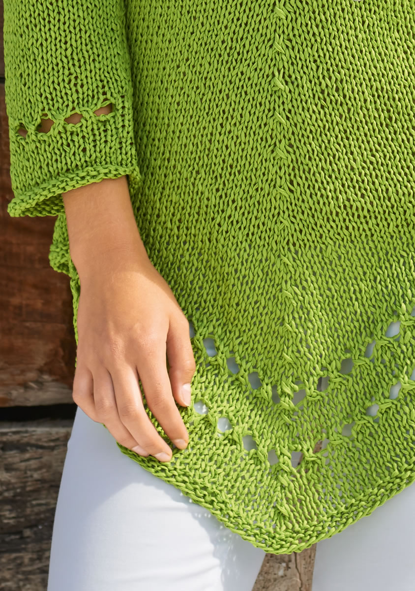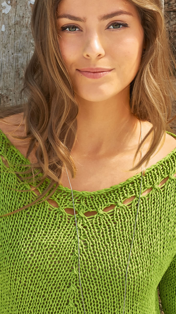 Ganz schön frisch. Wie effektvoll asymmetrischer Strick mit Lochspitze wirkt, beweist uns diese frühlingsgrüne Stricktunika. Das Garn: ein voluminöses Baumwollbändchen. Der Stil: Minimalismus mit einer Prise Extravaganz, dabei herrlich unkompliziert und ziemlich cool!