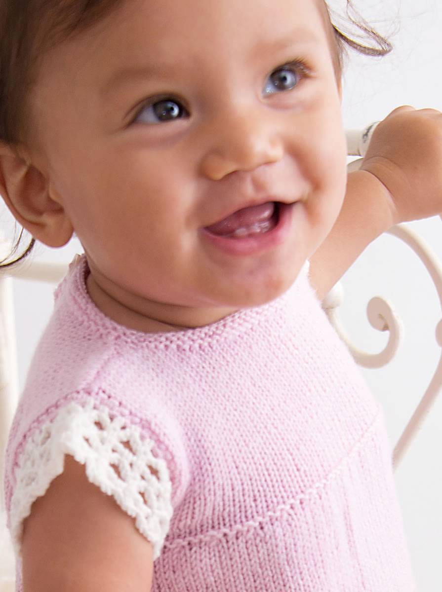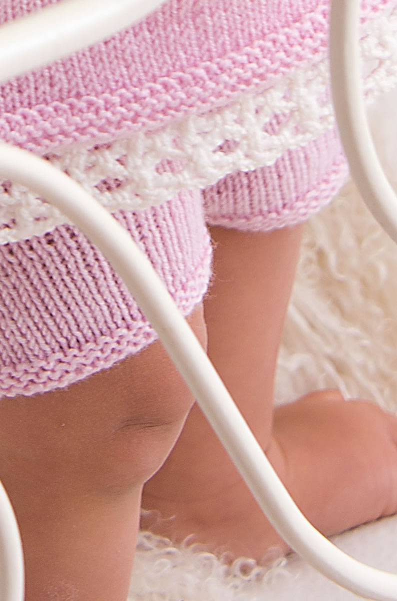 Lana Grossa Qualität „Cool Wool Baby“, 100 % Schurwolle, Lauflänge 220 m/50 g; ca. 100 g Rosa (Fb 216) und 50 g Rohweiß (Fb 213); eine 60 cm lange Rundstricknadel Nr. 3,5; eine 40 cm lange Rundstricknadel Nr. 3,5, eine Häkelnadel Nr. 3; 2 Knöpfe und Gummiband.