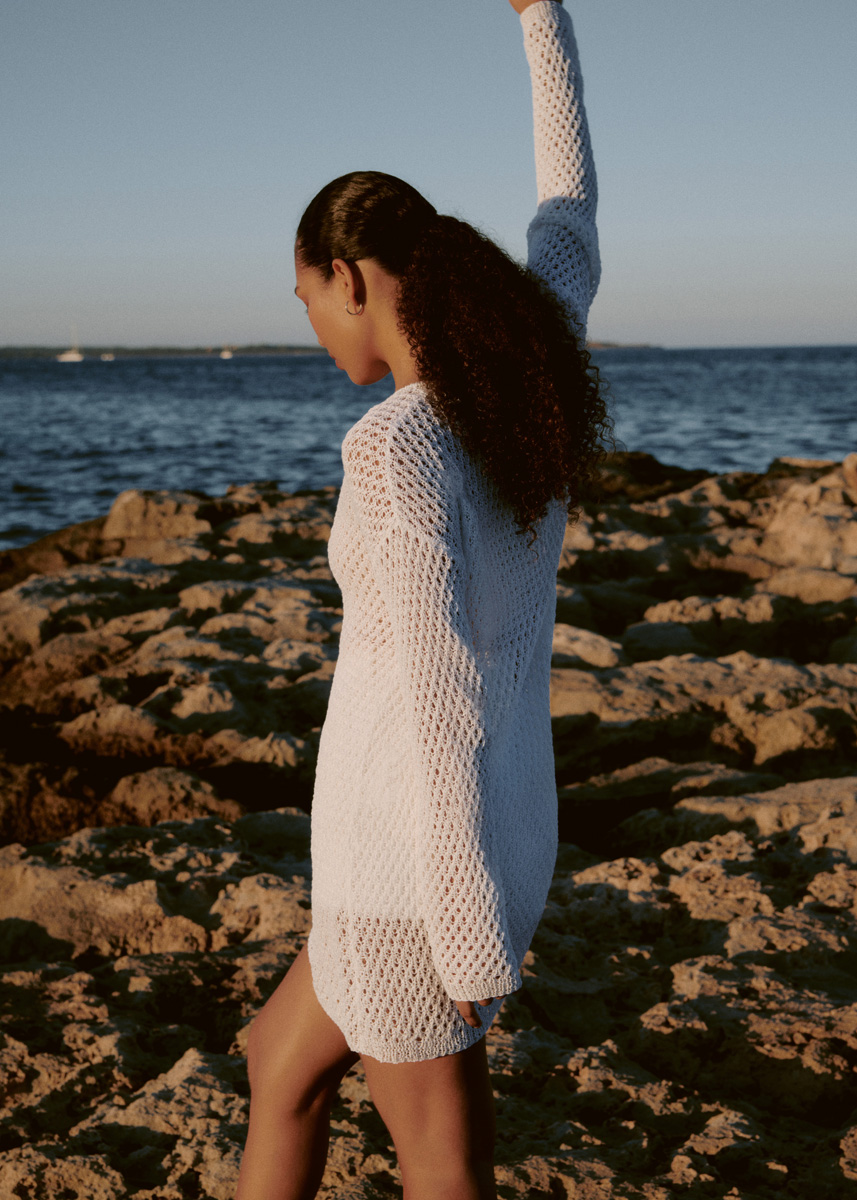 Strahlendes Weiß und eine lockere Netz-Struktur: Diese Strick-Tunika ist das Schönste, was zarter Sommerbräune passieren kann. Wir tragen sie mit Bikinis und/oder kurzen Denim-Shorts.