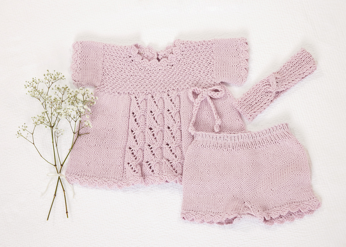 Lana Grossa Soft Cotton (70 % Baumwolle, 30 % Mikrofaser, Lauflänge = 140 m/50 g): 100 (150) g Rosa (Fb 6); eine 40 cm lange Rundstricknadel Nr. 3,5; Häkelnadel Nr. 3 und Nr. 5.; ein Knopf mit 13 mm Ø.