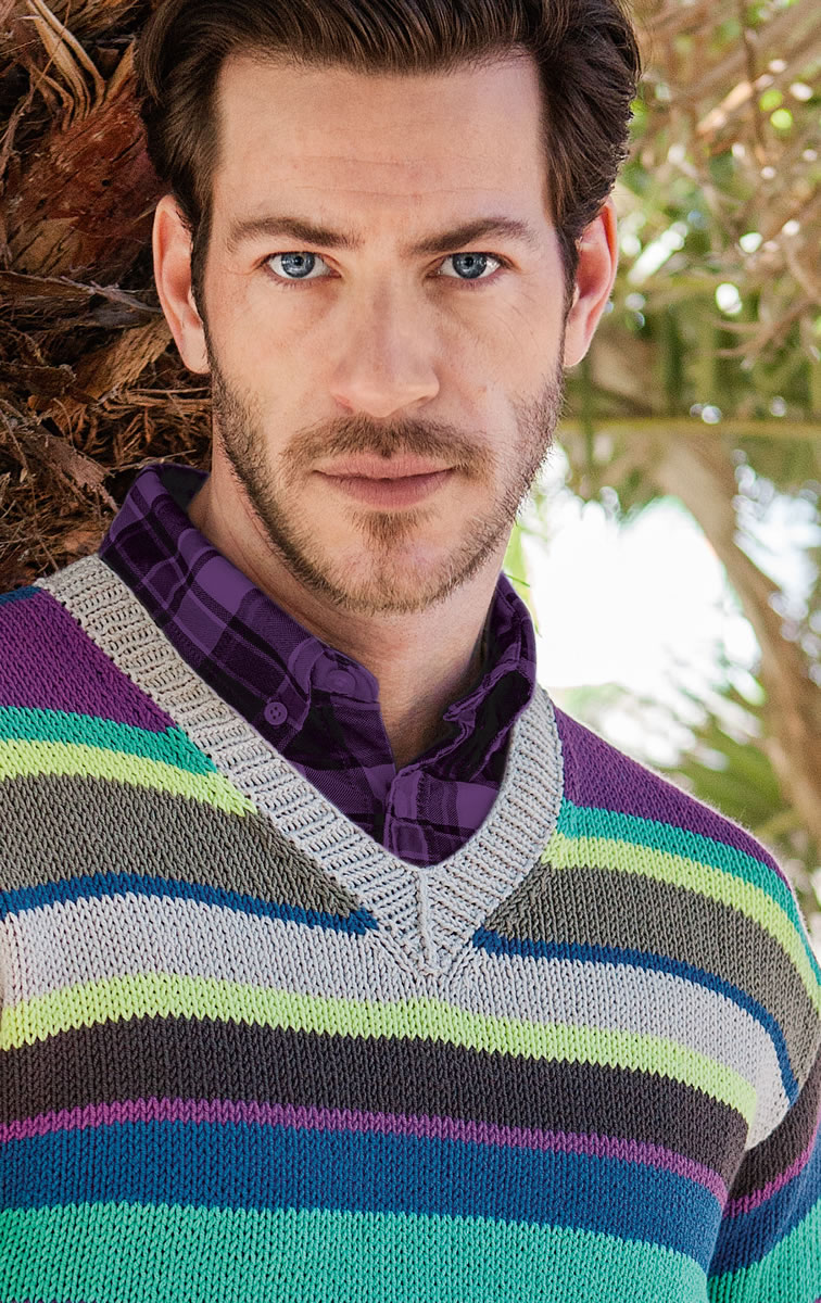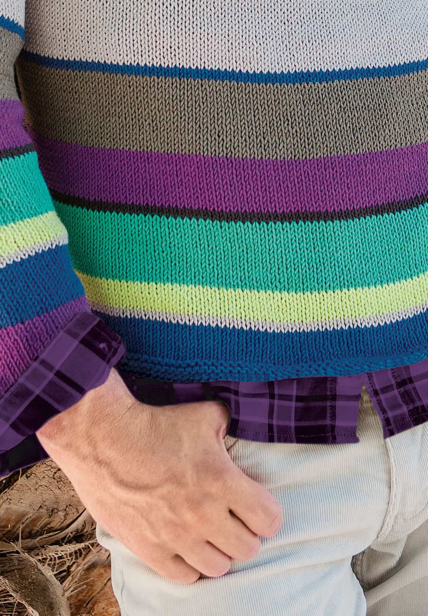 Zwischen Sonne, Sand und Palmen gibt es für Männer nur ein Mode-Gesetz: total entspannte Stricklooks! Trendmäßig aufgewertet, mit bunt gemixten Knallfarben, die sich im kreativen Streifenmix präsentieren.