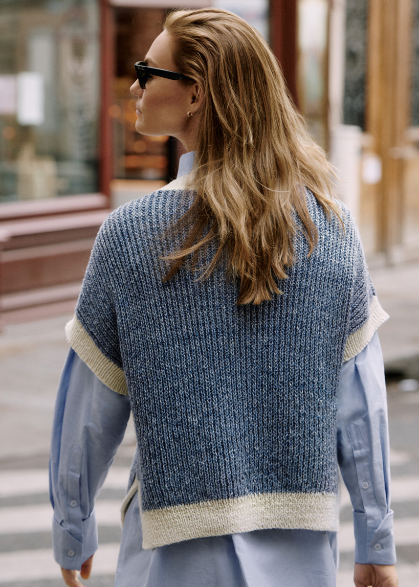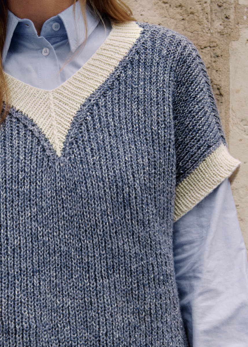 Lana Grossa-Qualität „Cara“ (57 % Alpaka (Baby), 33 % Baumwolle, 10 % Schurwolle (Merino), LL = ca 120 m/50 g): ca 400 (400 - 450 - 500) g Marine (Fb 21) und ca 150 (150 - 200 - 250) g Rohweiß (Fb 1); Stricknadeln Nr 3 und Nr 3,5; 1 kurze Rundstricknadel Nr 3.
