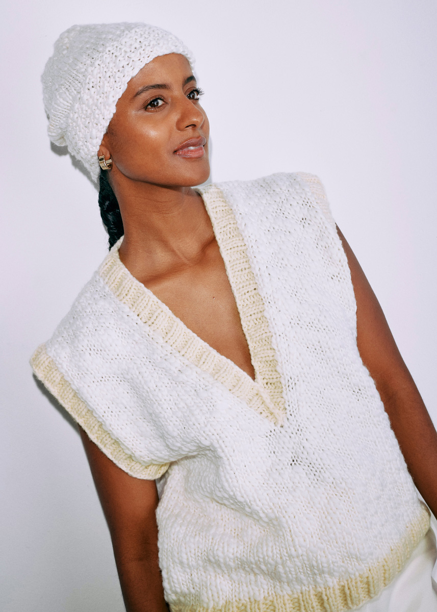 Lana Grossa-Qualität „Lala Berlin Lovely Cotton“ (75 % Schurwolle (Merino superfein), 25 % Baumwolle, LL = ca 90 m/50 g): ca 100 (150 - 150 - 200) g Rohweiß (Fb 33); Lana Grossa-Qualität „Lala Berlin Flamy“ (100 % Schurwolle (Merino), LL = ca 70 m/100 g): ca 400 (500 - 500 - 600) g Weiß (Fb 1); Stricknadeln Nr 7 und 9; 1 kurze Rundstricknadel Nr 7.