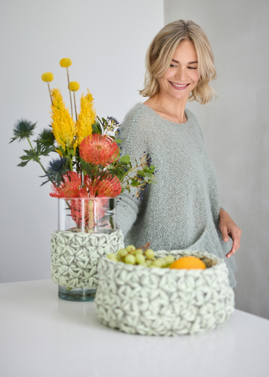 Lana Grossa-Qualität „The Tube” (60 % Baumwolle, 40 % Nylon, LL = ca. 114 m/200 g): ca. 200 g Weißgrün (Fb. 31) und Lana Grossa-Qualität „The Core” (50 % Baumwolle, 50 % Polyester, LL = ca. 85 m/100 g): ca. 200 g Graugrün (Fb. 6); 1 Wollhäkelnadel Nr. 9; einen Glaszylinder, ø 15 cm, 25 cm hoch.
