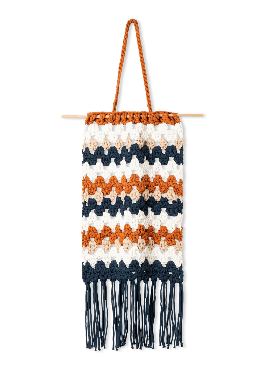 Lana Grossa-Qualität „The Tube” (60 % Baumwolle, 40 % Nylon, LL = ca. 114 m/200 g): je ca. 200 g Creme (Fb. 2), Beige (Fb. 17), Rost (Fb. 6) und Nachtblau (Fb. 21); 1 Wollhäkelnadel Nr. 9, 1 Rundstab aus Holz, ø 1 cm, ca. 40 cm lang.