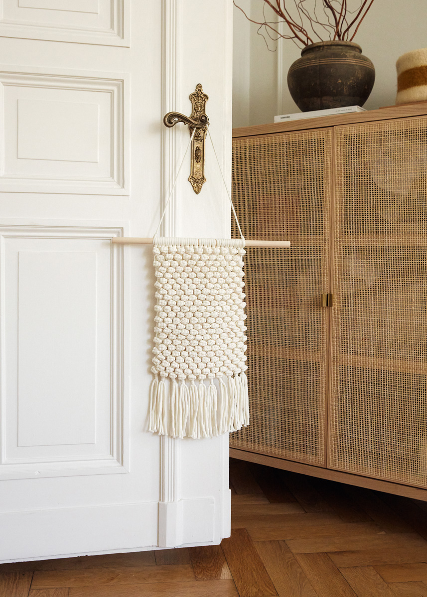 Lana Grossa-Qualität „The Tube” (60 % Baumwolle, 40 % Nylon, LL = ca. 114 m/200 g): ca. 200 g Creme (Fb. 102); 1 scharfe Schere; 1 Holzstab, 45 cm lang, ø 1,5 cm; 1 Kleiderständer und 2 S-Haken zum Befestigen des Holzstabs beim Knüpfen; 1 stumpfe Nähnadel; 1 Wollhäkelnadel Nr. 4 für die Beerenknoten.
