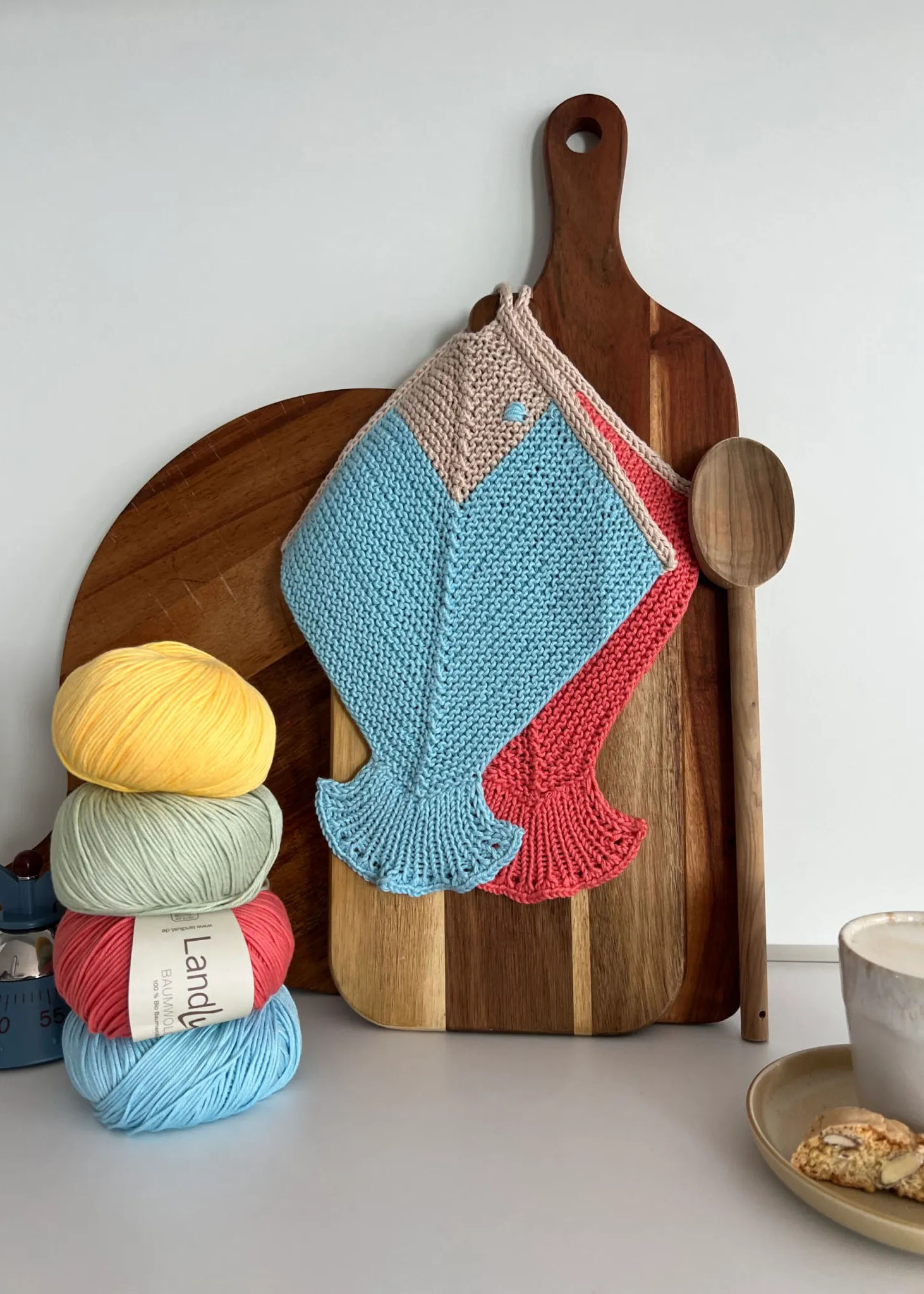 Landlust Baumwolle (100% Bio-Baumwolle; Lauflänge: ca. 115 m / 50g) je 50g von Lana Grossa in Beige (Farbe 15), Jeans (Farbe 14) oder Lachs (Farbe 20); Rundstricknadel Nr. 3,5 - 4,0 mm; Für den Randabschluß 2 kurze Nadelspielnadeln, 15 cm lang in Stärke 3,0 mm; stumpfe Wollsticknadel