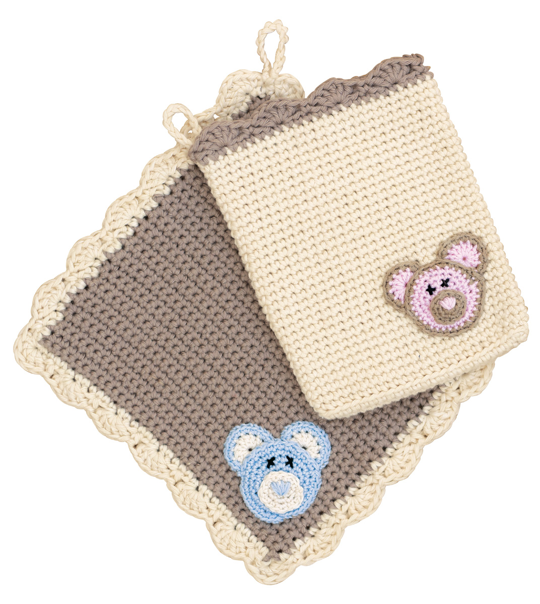 Lana Grossa Star (100 % Baumwolle, Lauflänge 90 m/50 g) 50 g Taupe (Fb 59) und 50 g Natur (Fb 27) und Cotone (100 % Baumwolle, Lauflänge 125 m/50 g) 50 g Rosa (Fb 1), 50 g Beige (Fb 26) und 50 g Schwarz (Fb 21); Häkelnadel Nr. 3 und 4.