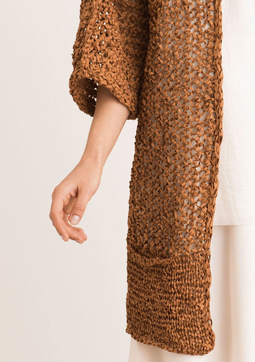 Lana Grossa Alcanto (70 % Polyester, 30 % Polyamid, Lauflänge 130 m/50 g) 350 (400/450) g Lehmbraun (Fb 16); Stricknadeln Nr. 6; eine 40 cm lange Rundstricknadel Nr. 6.