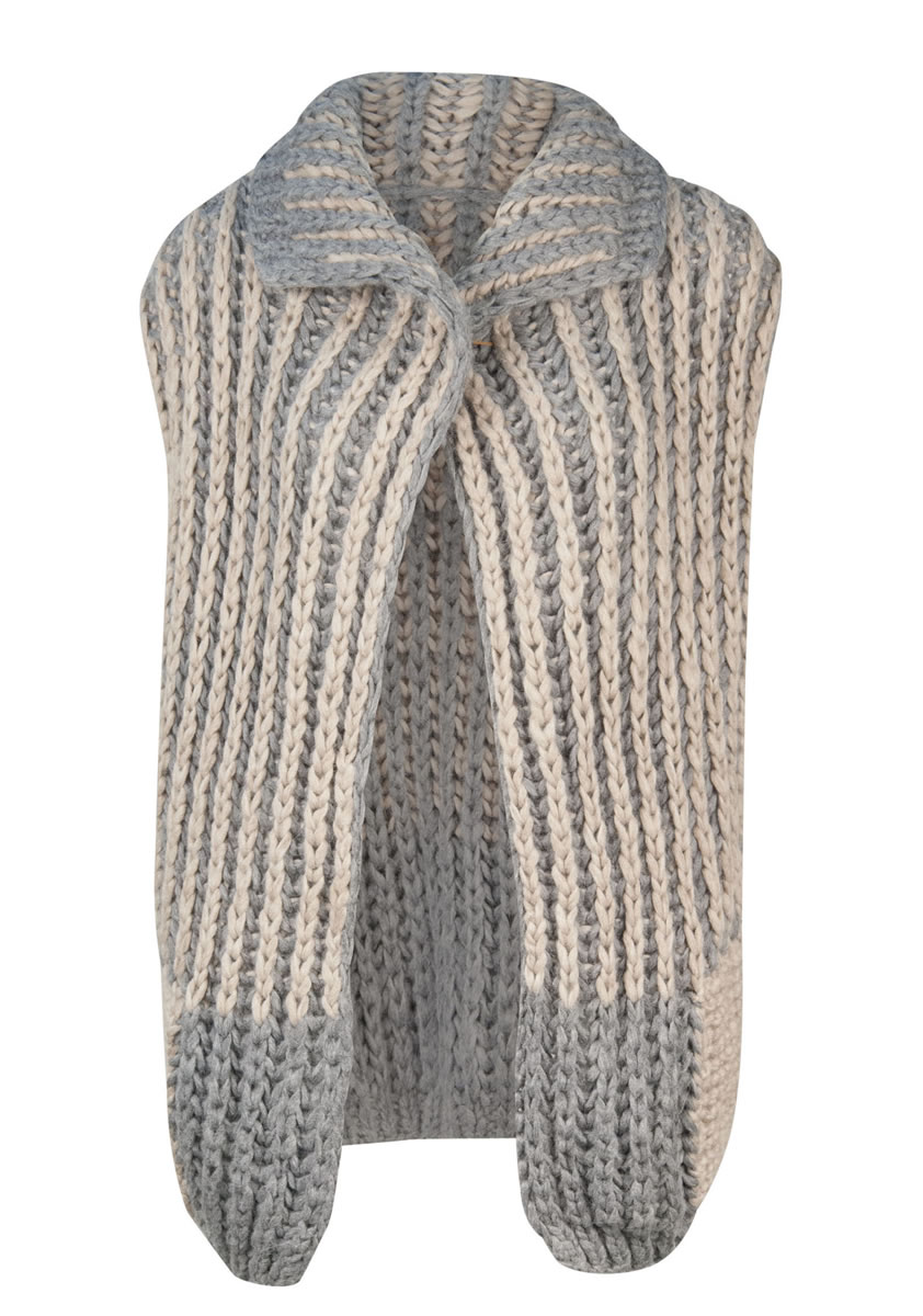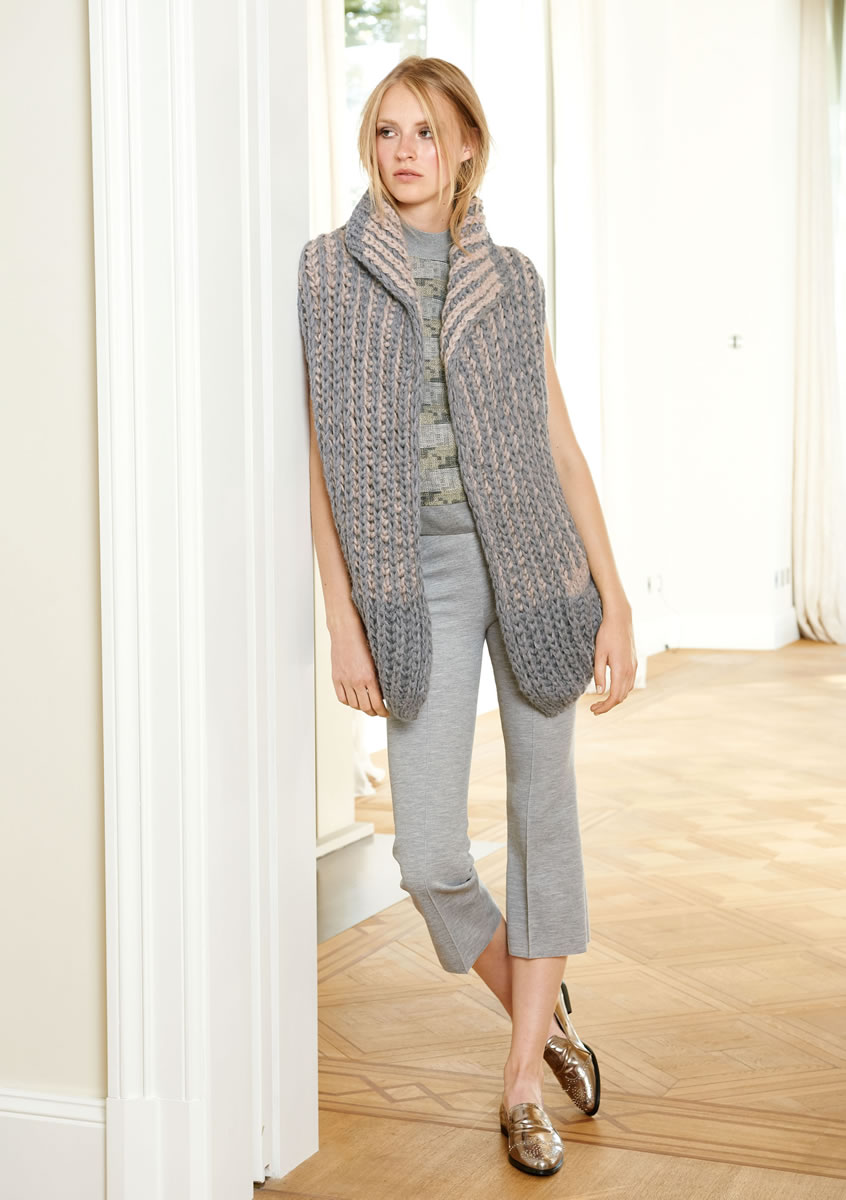 Lana Grossa Ambiente (70 % Schurwolle, 30 % Alpaca, Lauflänge 40 m/50 g); 400 (450/500) g Grau (Fb. 2) und 250 (300/350) g Beige (Fb. 8); 2 Rundstricknadeln Nr. 10.