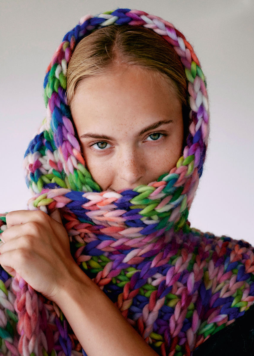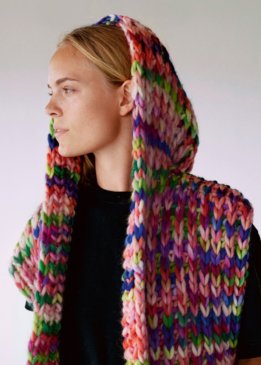 Lana Grossa „Confetti“ (100 % Schurwolle (Merino), Lauflänge 50 m/100 g), 1200 g Erdbeer/Viola/ Fuchsia/Grün/Blau/Weiß (Fb 2); Stricknadeln Nr 10 und 12; Häkelnd Nr 12