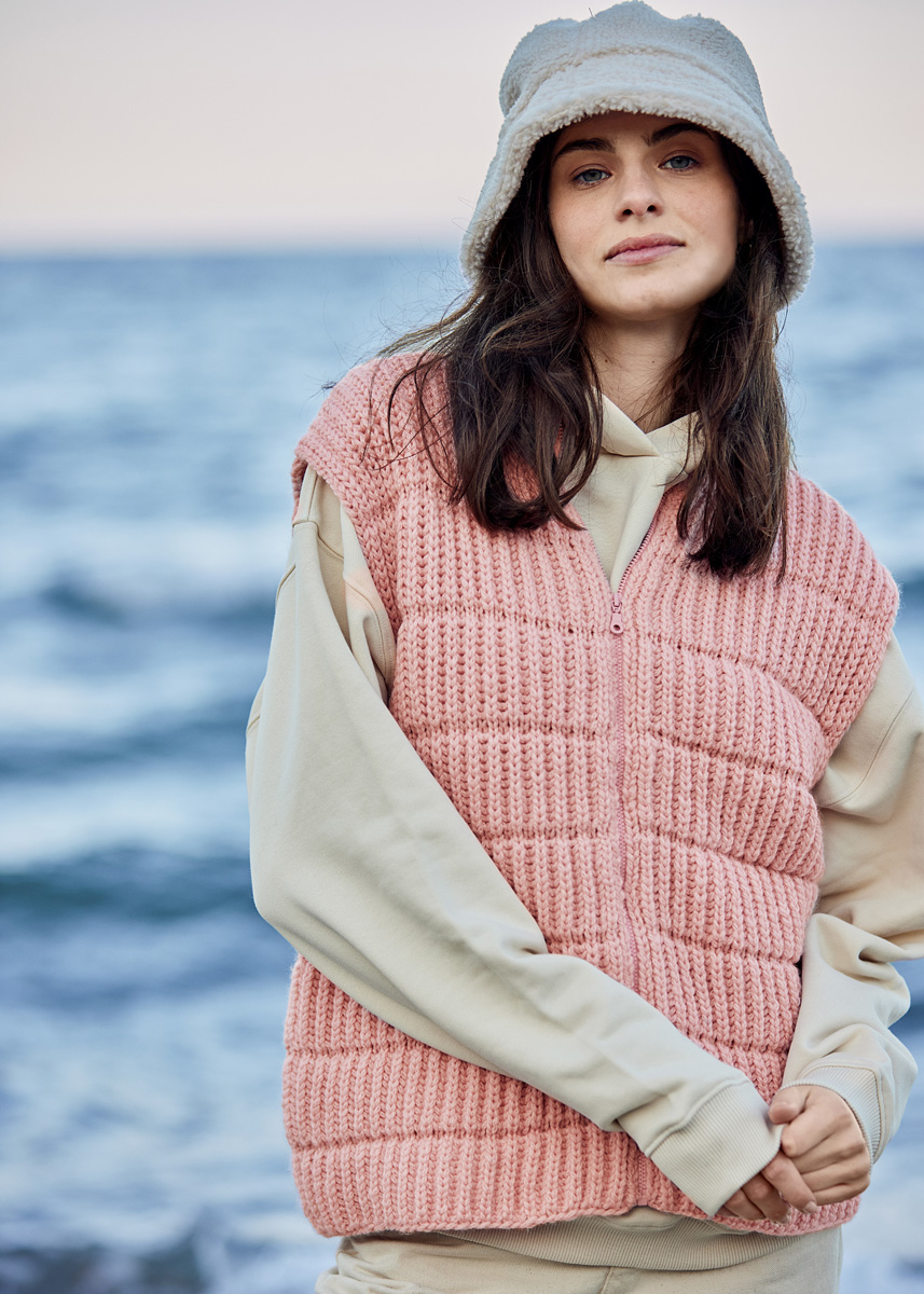 Lana Grossa-Qualität „Cool Merino Big“ (90 % Schurwolle (Merino), 10 % Polyamid, LL = ca 90 m/50 g): ca 500 (550 - 600 - 650) g Rosa (Fb 211); Stricknadeln Nr 4 und 5; 1 kurze Rundstricknadel Nr 4; 1 teilbarer Reißverschluss in Rosa, 60 cm lang.