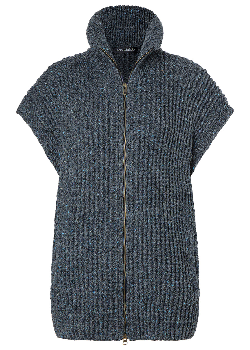 Lana Grossa Country Tweed (100% Schurwolle, Lauflänge 90 m/50 g), 800 (850 – 900) g Anthrazit meliert (Fb 5); Stricknadeln Nr. 4 und 6, 1 Rundstricknadel Nr. 6, 40 cm lang, 1 Zwei-Wege- Reißverschluss von YKK, Metall, Fb Anthrazit, 75 cm lang.