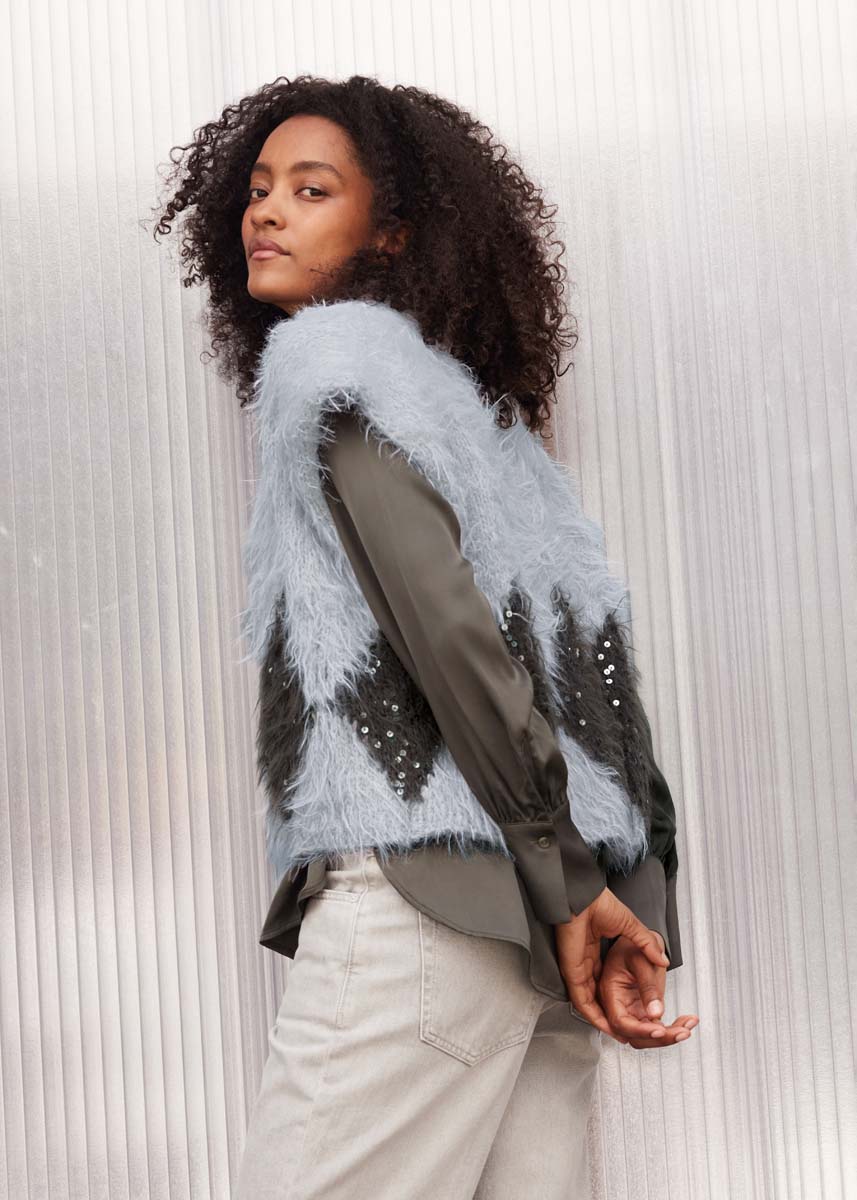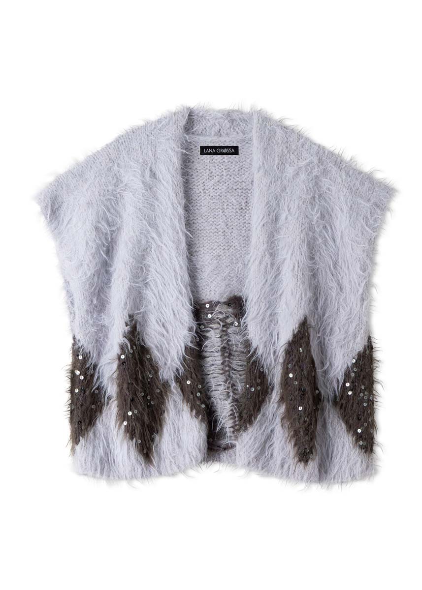 Die glamouröse Flauschgarnweste besteht aus einem Rechteck mit t-förmigem Schlitz und paillettenbestückten Rhomben. Gestrickt wird glatt rechts und doppelfädig.