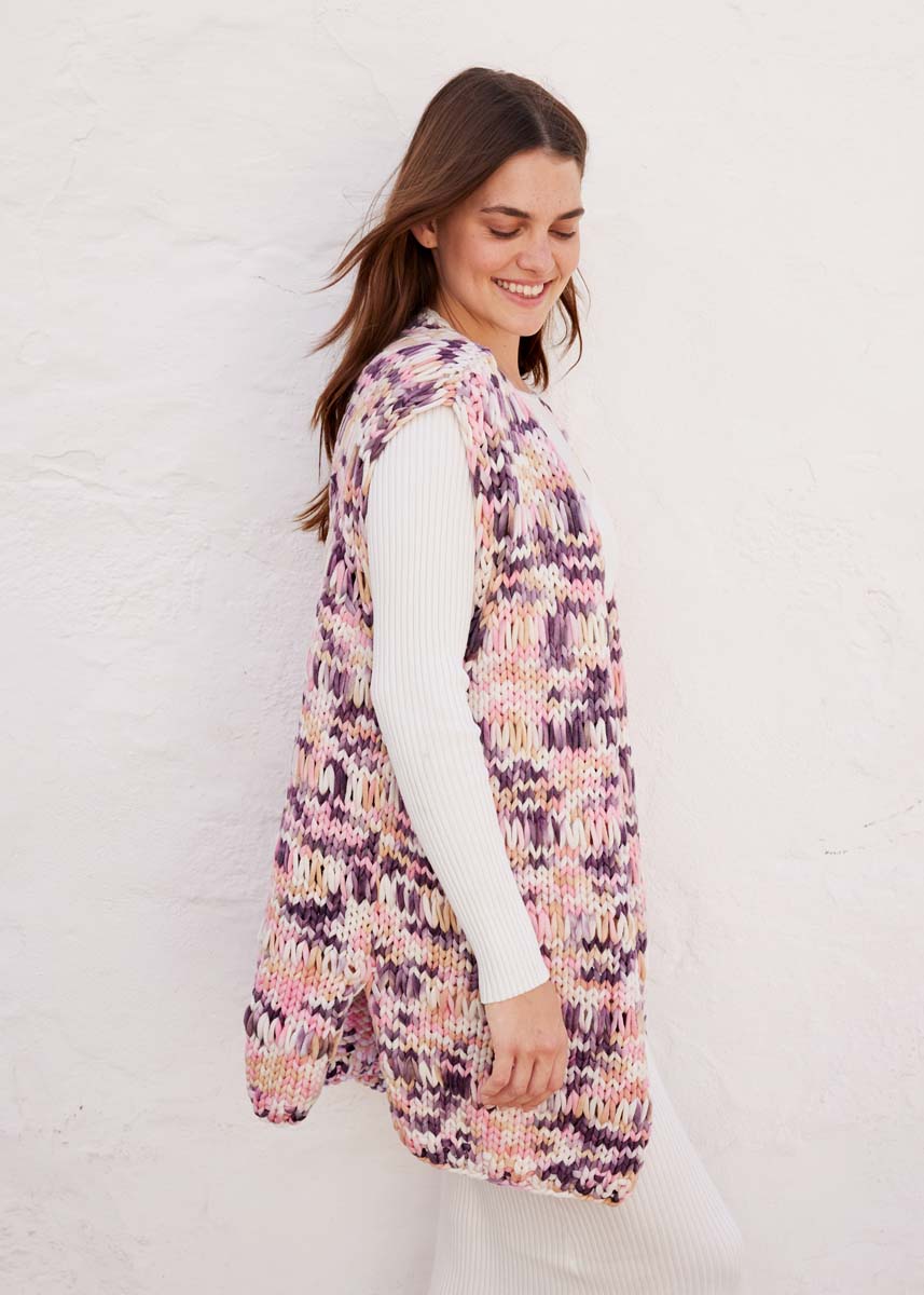 Lana Grossa „Gelato“ (52% Baumwolle, 48% Polyamid (rec.), Lauflänge 80 m/100 g), 700 (900) g in Pflaume/Rosa/Beige/Rohweiß (Fb. 11); Stricknadeln Nr. 15.