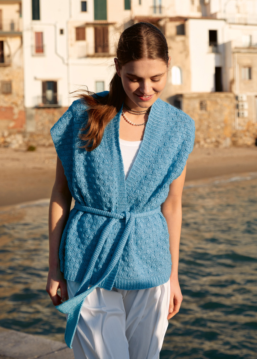 Wow, Türkisblau! Stäbchenstrukturmuster, Rosenstäbchen (Blenden) und der Gürtel im tunesischen Grundstich bringen Struktur ins maritime Modell – ECOPUNO.