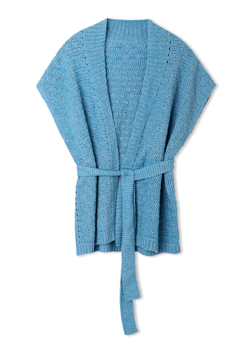 Lana Grossa-Qualität „Ecopuno” (72 % Baumwolle, 17 % Schurwolle (Merino), 11 % (Baby) Alpaka, LL = ca. 215 m/50 g): ca. 450 (500 – 550) g Türkisblau (Fb. 29); 1 Wollhäkelnadel Nr. 4 mit gleichmäßig dickem Schaft.