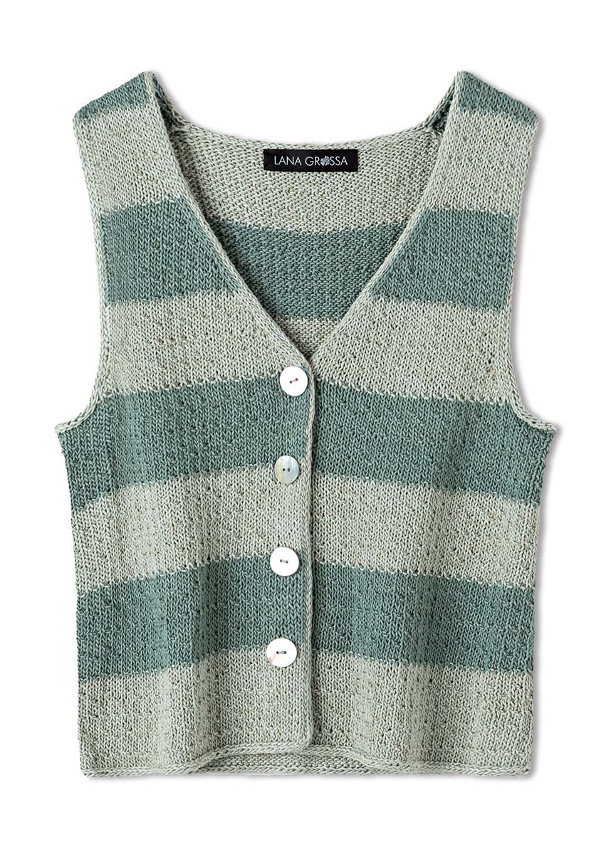 Lana Grossa-Qualität „Solo Lino” (80 % rec. Leinen (Viskose), 20 % Leinen, LL = ca. 120 m/50 g): ca. 150 (200 – 250) g Pastellgrün (Fb. 60) und ca. 100 (150 – 150) g Resedagrün (Fb. 20); je 1 Rundstricknadel Nr. 3, 60 und 100 cm lang; 4 Perlmuttknöpfe, ø 20 mm, blassgrün.
