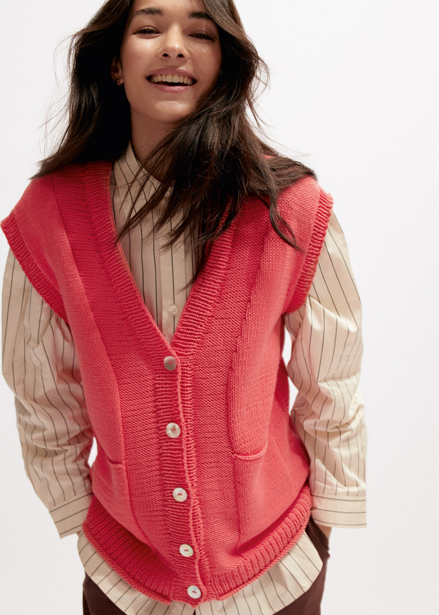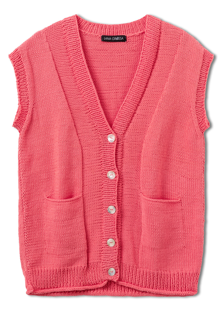 Lana Grossa Landlust Baumwolle (100% Baumwolle (Bio), Lauflänge 115 m/50 g), 400 (400 – 450) g Lachs (Fb 20); Stricknadeln Nr. 3 und 4, je 1 Rundstricknadel Nr. 3, 40 und 100 cm lang, und 5 Knöpfe von UNION KNOPF, Art. 46286, Fb 12, Ø 20 mm.
