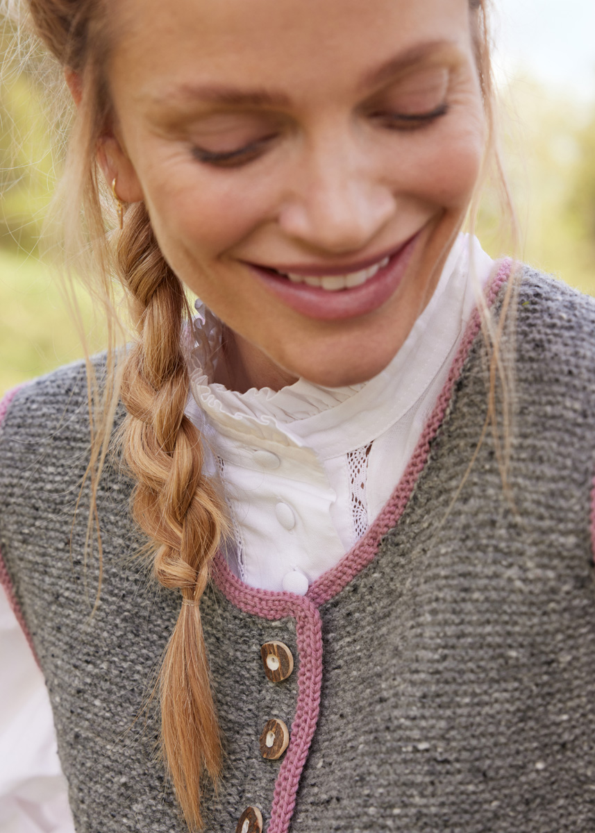 Die graumelierte Tweed-Weste punktet mit einem tiefen Ausschnitt, der dekorativen Blusenkragen viel Platz einräumt. Abgerundet wird das kraus gestrickte Modell durch kleine Hirschhornknöpfe und Akzente in Altrosa.