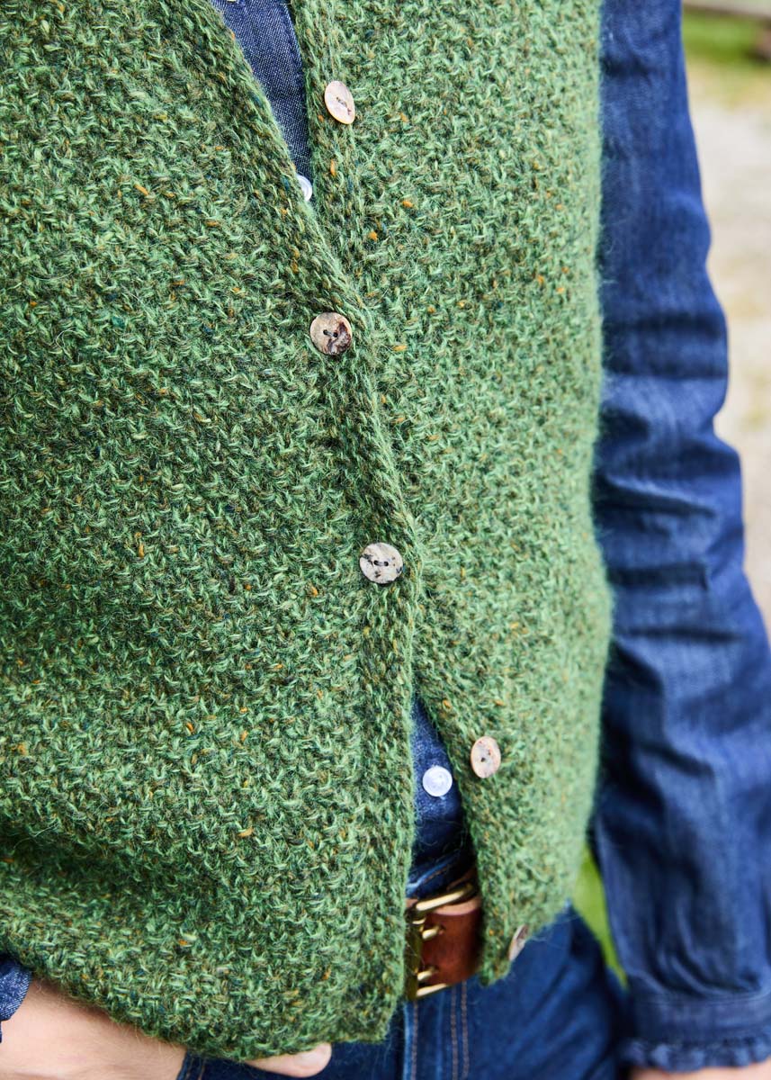 Lana Grossa-Qualität „Landlust- Soft-Tweed 180“ (100% Schurwolle, LL ca. 180 m/50 g), 150 (200 - 200 - 250) g in Dunkelgrün Meliert (Fb 107), „Landlust-Kidmohair“ (70% Mohair Superkid, 30% Baumwolle, LL ca. 225 m/25 g), 75 (75 - 100 - 100) g in Grün (Fb 4); Stricknadeln Nr. 4,5 und Nr. 5, je 1 Rundstricknadel Nr. 4,5, 40 cm und 80 cm lang, 5 Knöpfe, 15 mm Ø.