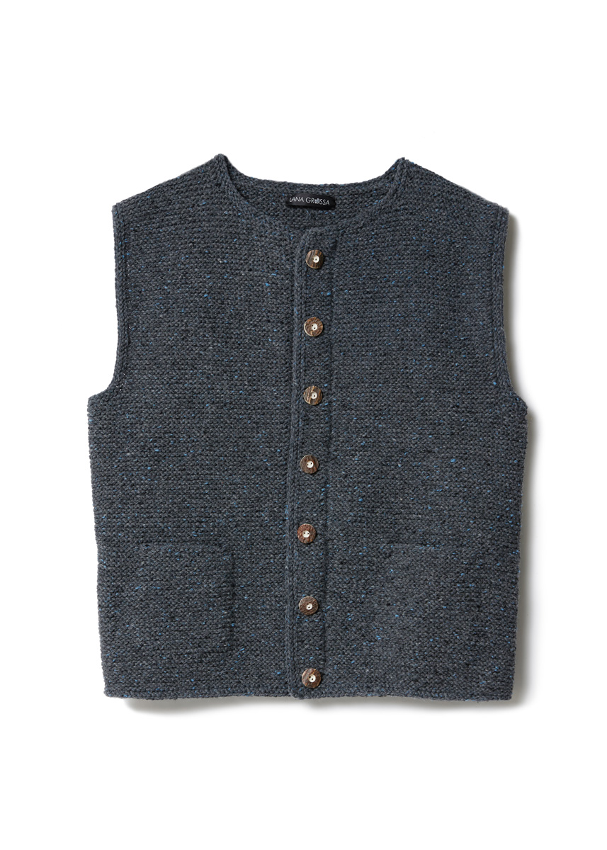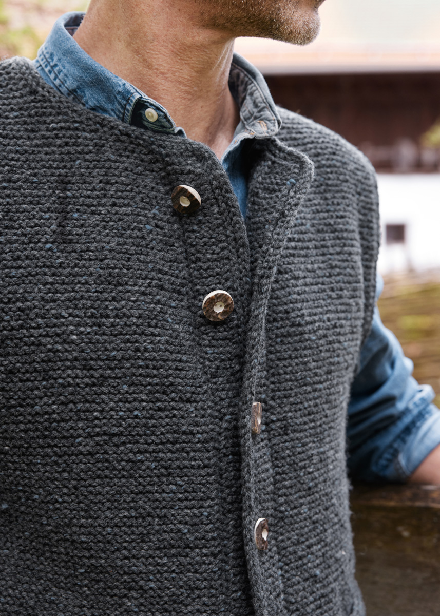 Perfekt für wärmere Tage: die klassische Weste aus anthrazitfarbenem Tweed-Garn. Gestrickt wird kraus rechts. Um die Knopfleiste optisch abzusetzen, genügt eine Patentmasche pro Reihe.