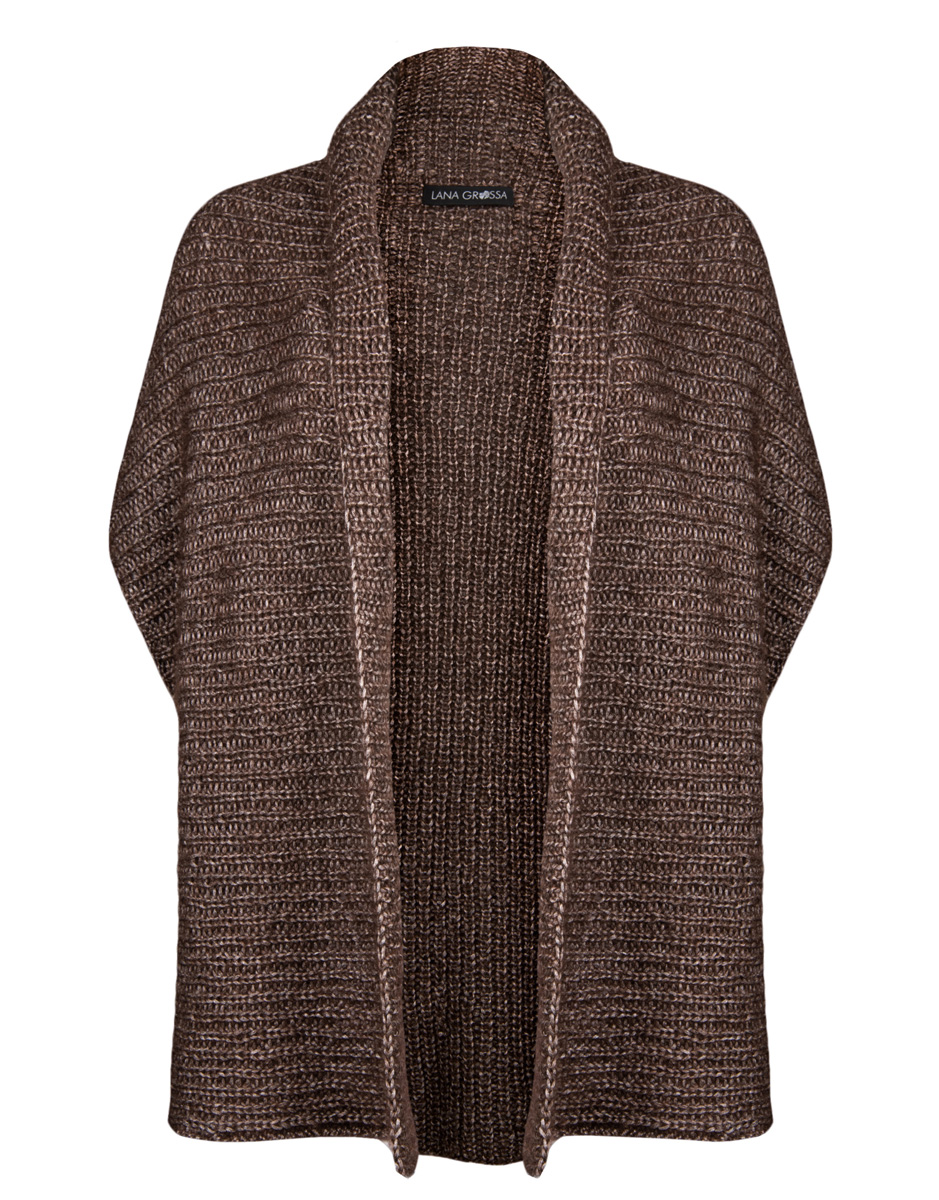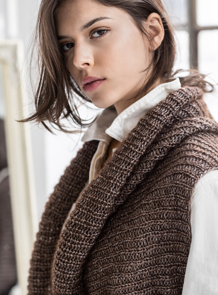 Lana Grossa Mia (30 % Mohair, 26 % Schurwolle, 19 % Polyamid, 25 % Seide, Lauflänge 105 m/25 g) 250 (275 – 300) g Braun (Fb 9); Stricknadeln Nr. 6.