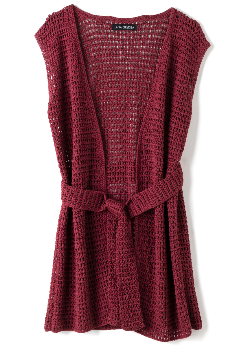 Eine lange Weste aus zusammen abgemaschten halben Stäbchen, funktioniert perfekt über Kleidern – SOLO LINO.