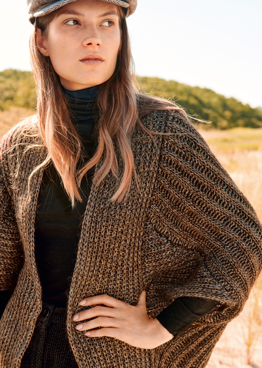 Lana Grossa-Qualität „Mia” (30 % Mohair, 26 % Schurwolle (Merino), 25 % Seide, 19 % Polyamid, LL = ca. 105 m/25 g): ca. 350 g Braun (Fb. 9) und Lana Grossa-Qualität „Brillino” (83 % Viskose, 17 % Metallische Faser, LL = ca. 200 m/25 g): ca. 250 g Camel/Gold (Fb. 4); Stricknadeln Nr. 5,5, 1 Rundstricknadel Nr. 5,5, 80 cm lang, 1 Wollhäkelnadel Nr. 5.