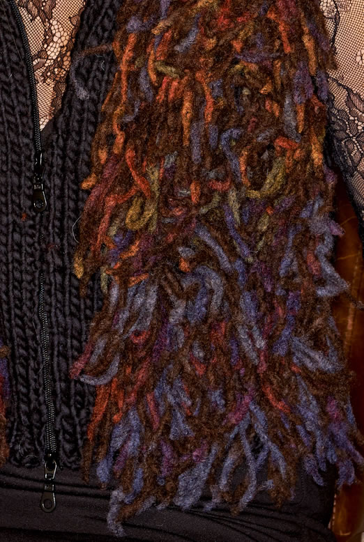 Lana Grossa-Qualität „Lei“ (100 % Schurwolle (Merino), Lauflänge ca. 40 m/50 g): ca. 350 (400 – 450) g Schwarz (Fb. 7) und für die Fransen Lana Grossa-Qualität „Nordico“ (60 % Schurwolle (Merino), 22 % Polyamid, 18 % Polyacryl, Lauflänge ca. 90 m/50 g): ca. 100 g Rot-/Dunkelbraun/Rost/Beere (Fb. 15); Stricknadeln Nr. 9 und 10, 1 Rundstricknadel Nr. 10, 60 cm lang; ein 2-Wege-Metallreißverschluss von Prym, M5 Type 10, 50 (50 – 55) cm lang, Fb. 000 schwarz