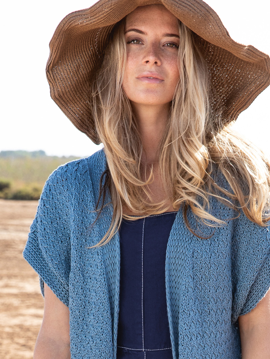 Lana Grossa-Qualität „Organico” (100 % (Bio) Baumwolle, LL = ca. 90 m/50 g): ca. 500 (550 – 600) g Taubenblau (Fb. 101); Stricknadeln Nr. 3,5 und 4,5.