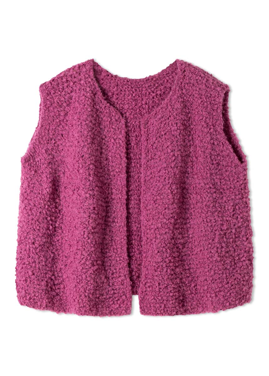 Dreifach verzwirnt sorgt Bouclé-Garn Orsetto (neu) für ein reibungsloses Strickvergnügen. Hier wurde es kraus rechts zu einer schlichten Oversize-Weste verarbeitet.