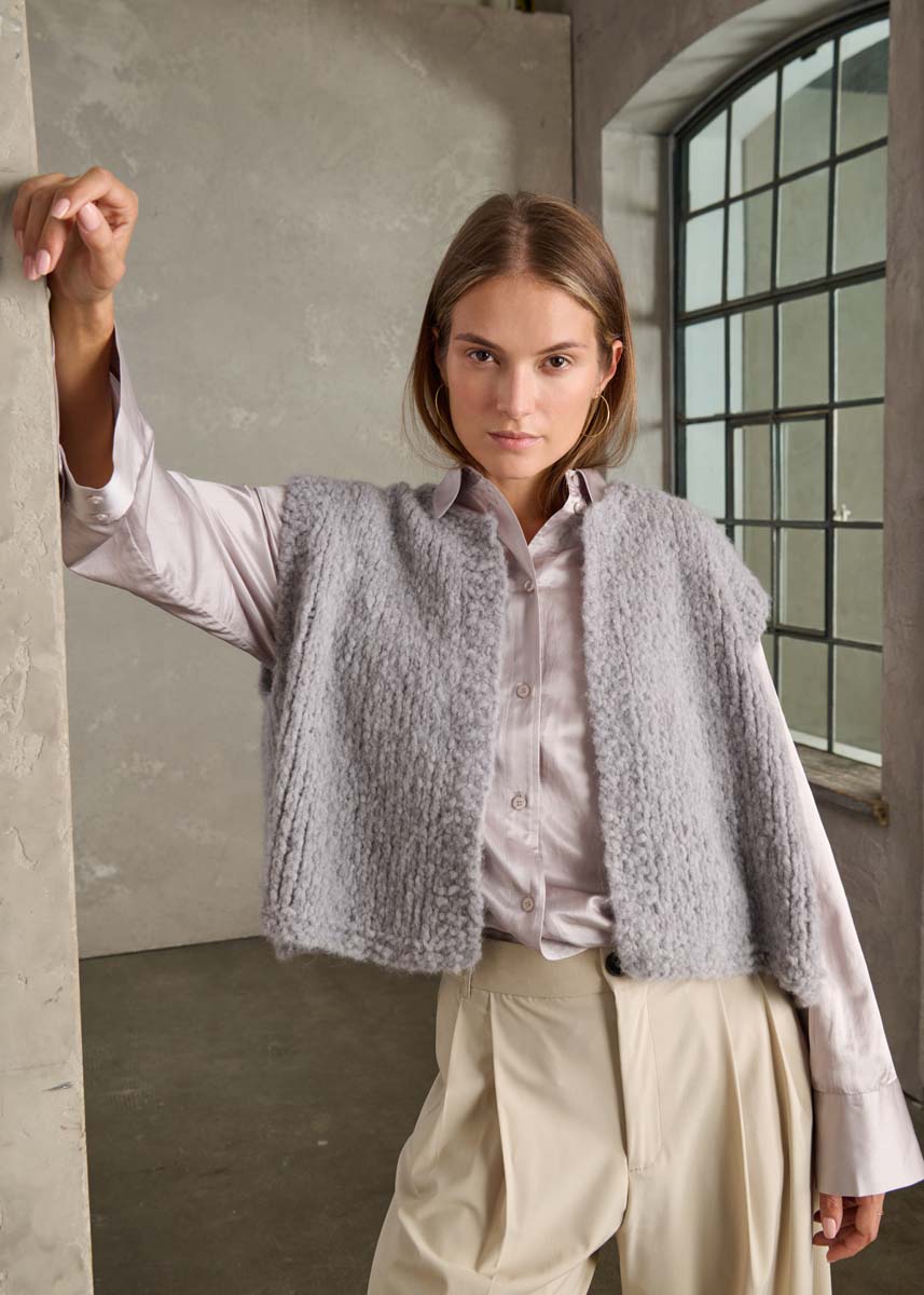 Lana Grossa „Royal Alpaca“ (93% Alpaka (Royal), 7% Polyamid; LL = ca. 95 m 50 g): ca. 150 (150 – 200) g Hellgrau (Fb. 10); eine Rundstricknadel Nr. 9, Länge 80 cm