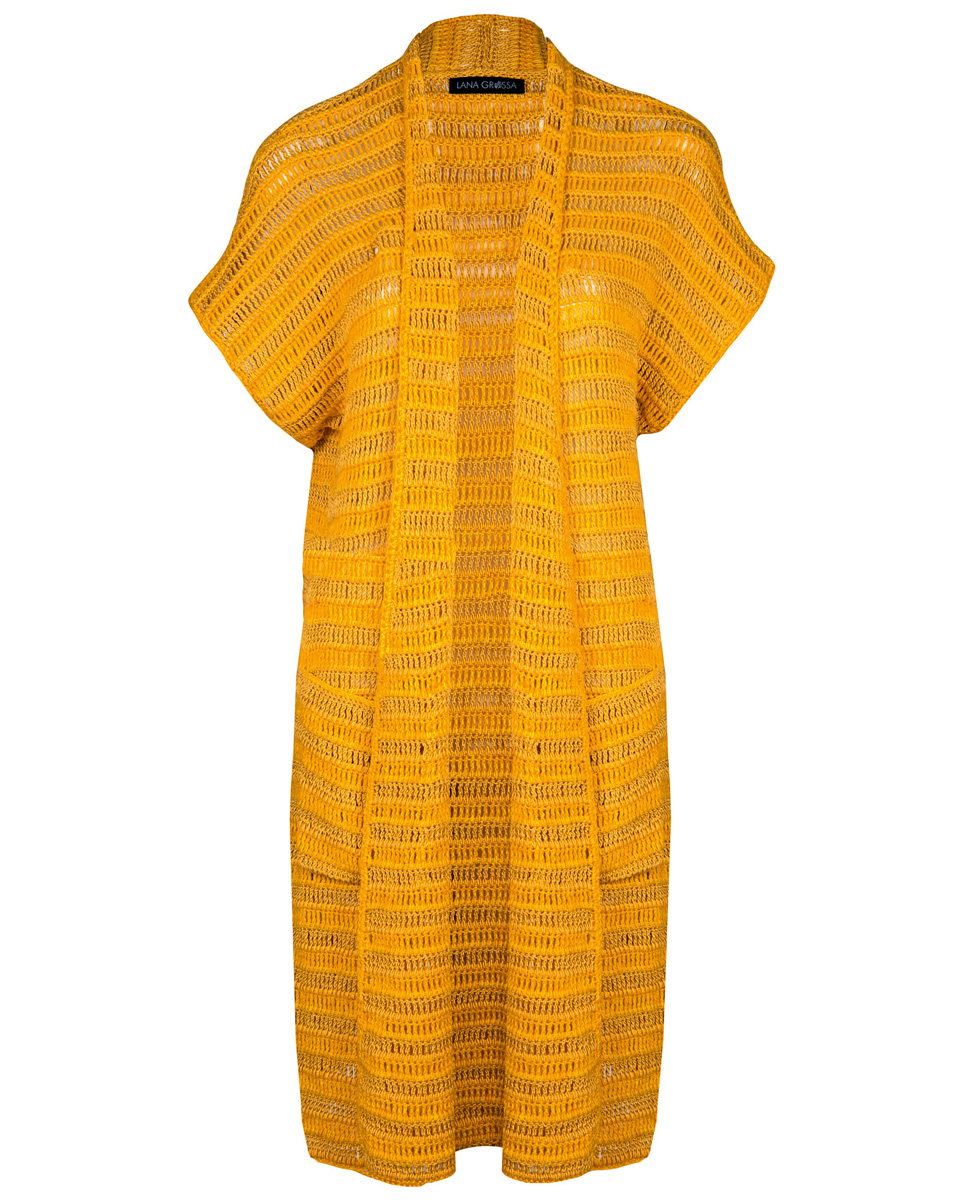 Lana Grossa Solo Lino (80 % recyceltes Leinen (Viskose), 20 % Leinen, Lauflänge 120 m/50 g), 500 (550 – 600) g Sonnengelb (Fb 15) und Lana Grossa Ecopuno (72 % Baumwolle, 17 % Schurwolle Merino, 11 % Baby Alpaca, Lauflänge 215 m/50 g), 300 (350 - 400) g Gelb (Fb 4); 1 Häkelnadel Nr. 3.