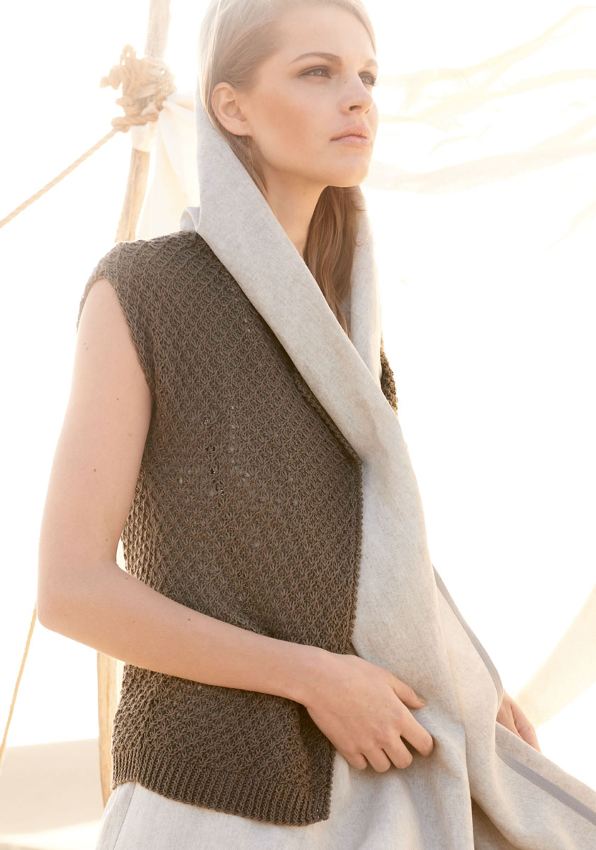 Lana Grossa Solo Lino (80 % recyceltes Leinen (Viskose), 20 % Leinen, Lauflänge 120 m/50 g) 300 (350 - 350) g Schlamm (Fb 7); Stricknadeln Nr. 3,5, 4,5 und 5,5, Häkelnadel Nr. 4,5.