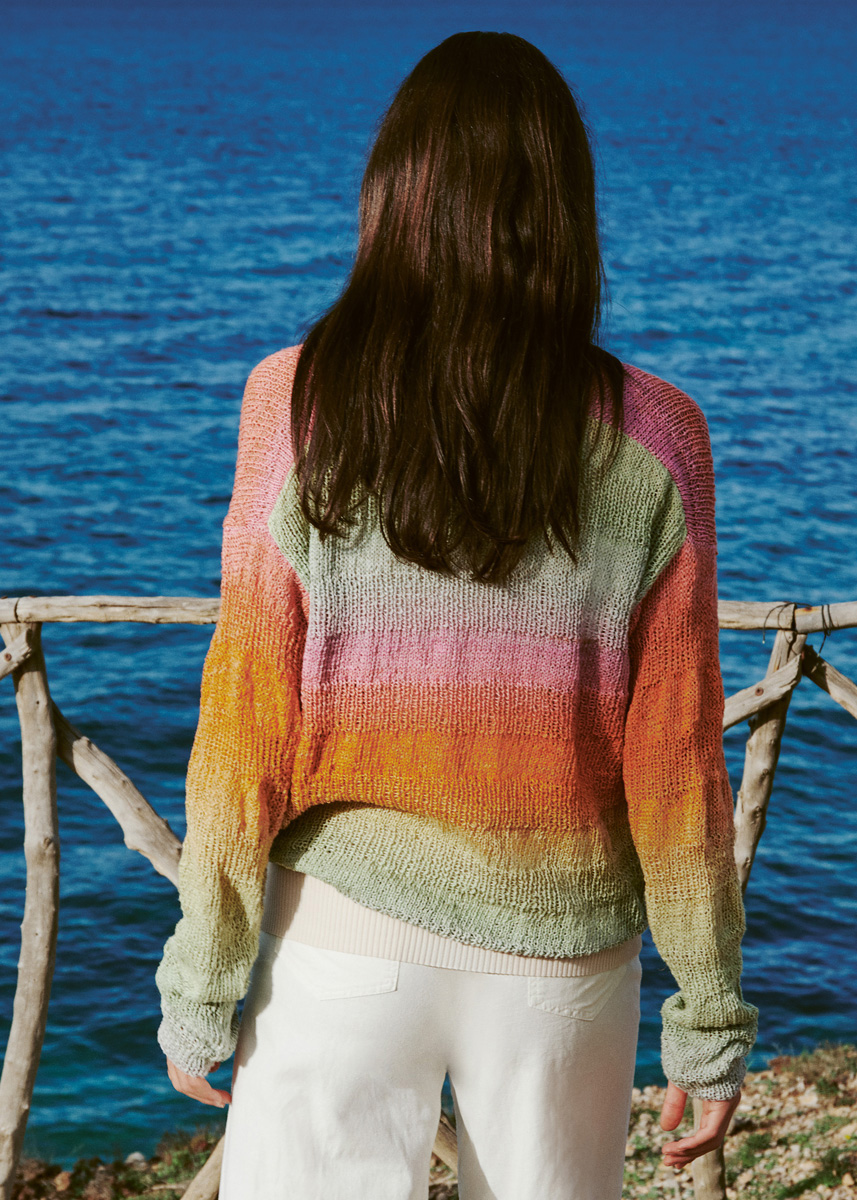 Lana Grossa-Qualität „Mare” (50 % Leinen, 33 % Seide, 17 % Baumwolle, LL = ca. 330 m/100 g): ca. 400 (500) g Mint/Lindgrün/ Gelb/Orange/Lachs/Flieder (Fb. 1); Stricknadeln Nr. 3,5; 1 Perlmuttknopf, natur, ø 20 mm, 1 Plastik- Druckknopf, ø 22 mm, in passender Farbe.
