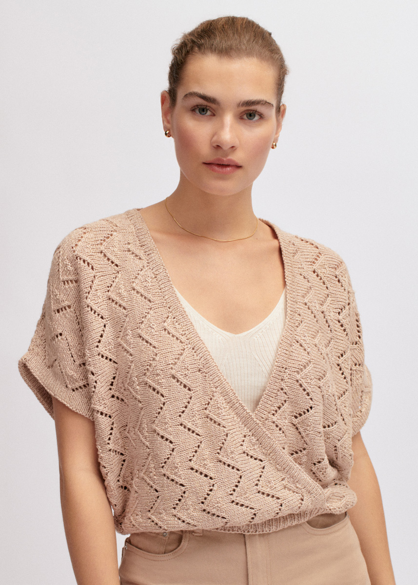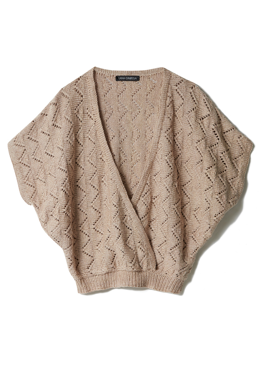 Lana Grossa Linarte (40% Viskose, 30% Baumwolle, 20% Leinen, 10% Polyamid, Lauflänge 125 m/50 g), 450 (500 – 550) g Beige (Fb 324); Stricknadeln Nr. 3,5 und 4,5, je 1 Rundstricknadel Nr. 3,5, 60 und 100 cm lang.