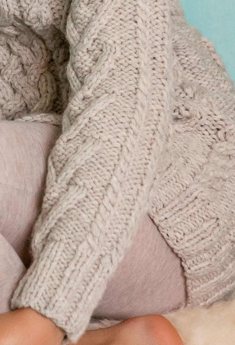Lana Grossa-Qualität „Alta Moda Super Baby” (67 % Schurwolle, 30 % (Baby) Alpaka, 3 % Polyamid, LL = ca. 60 m/ 50 g): ca. 1000 (1050 – 1100) g Grège (Fb. 9); Stricknadeln Nr. 8 und 9, 1 Rundstricknadel Nr. 9, 40 cm lang.