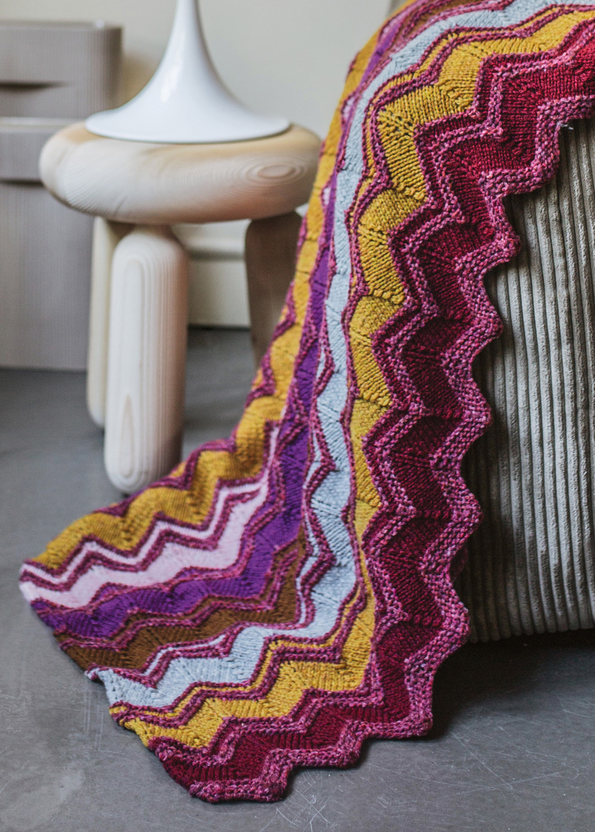 Sie strickt sich leichter, als man denkt, denn ihr Zackenmuster entsteht durch regelmäßige Zuund Abnahmen. Den hübschen Rest erledigen die Garne, die mal uni und mal bunt bedruckt sind.