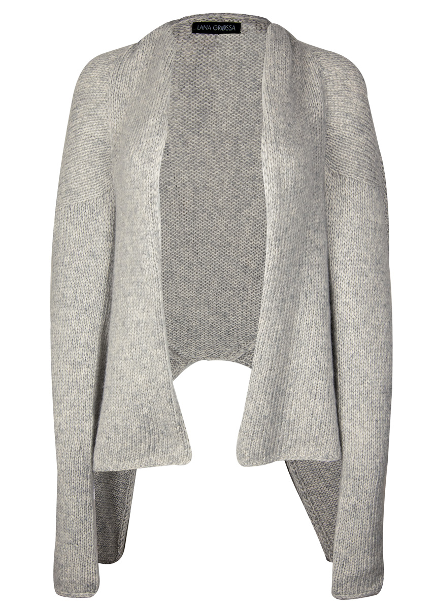 Lana Grossa-Qualität „Brigitte No. 2” (47 % (Baby) Alpaka, 45 % Baumwolle, 8 % Schurwolle (Merino), LL = ca. 140 m/50 g): ca. 450 (500) g Silbergrau (Fb. 13); 2 Rundstricknadeln Nr. 6,5, je 80 cm lang.
