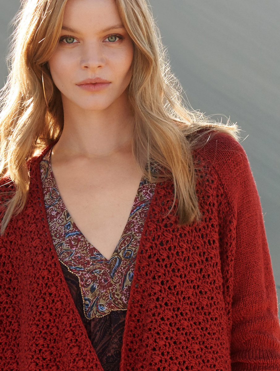 Lana Grossa-Qualität „Linarte” (40 % Viskose, 30 % Baumwolle, 20 % Leinen, 10 % Polyamid, LL = ca. 125 m/50 g): ca. 750 g Dunkelrot (Fb. 8); Spielstricknadeln Nr. 3,5 und 4,5, 1 Rundstricknadel Nr. 4,5, 60 cm lang, 1 Wollhäkelnadel Nr. 4,5.