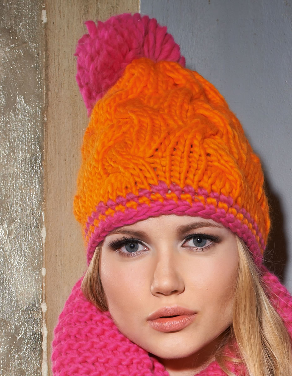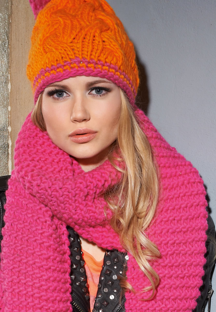 Lana Grossa-Qualität „Lei“ (100 % Schur- wolle (Merino), Lauflänge ca. 40 m/50 g): ca. 100 g Neonorange (Fb. 502) und ca. 50 g Neonpink (Fb. 504); Spielstricknadeln Nr. 10, 1 Wollhäkelnadel Nr. 6.