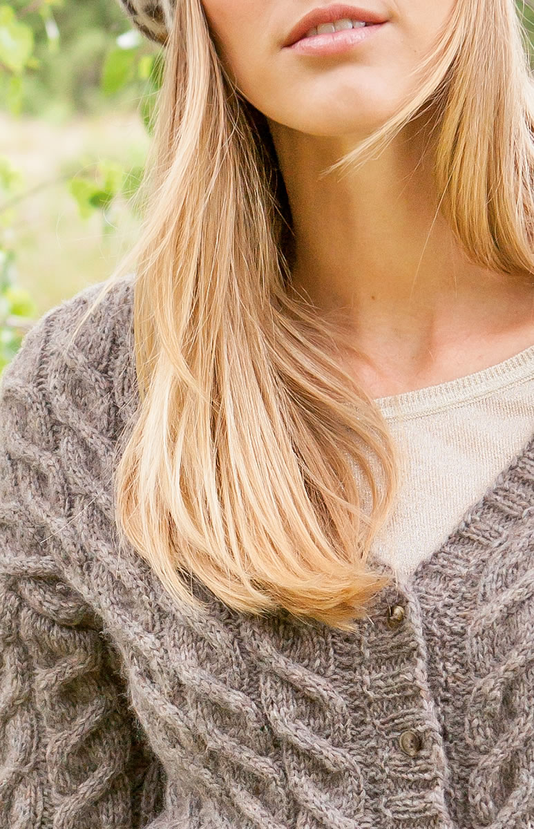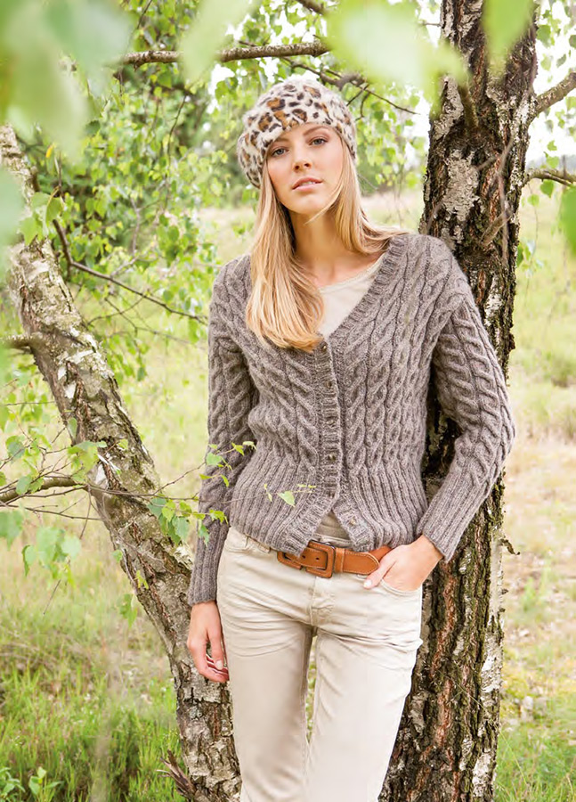 Lana Grossa „Evento” (65% Baumwolle, 35% Schurwol- le, LL = 160 m/50 g) 450 g Taupe (Fb 29). Stricknadeln Nr. 3,5 und 4 oder 4,5, eine lange Rundstricknadel Nr. 3,5 sowie 6 kleine Knöpfe (von Union Knopf, Art. 13359, Farbe 5, 11 mm Durchmesser).